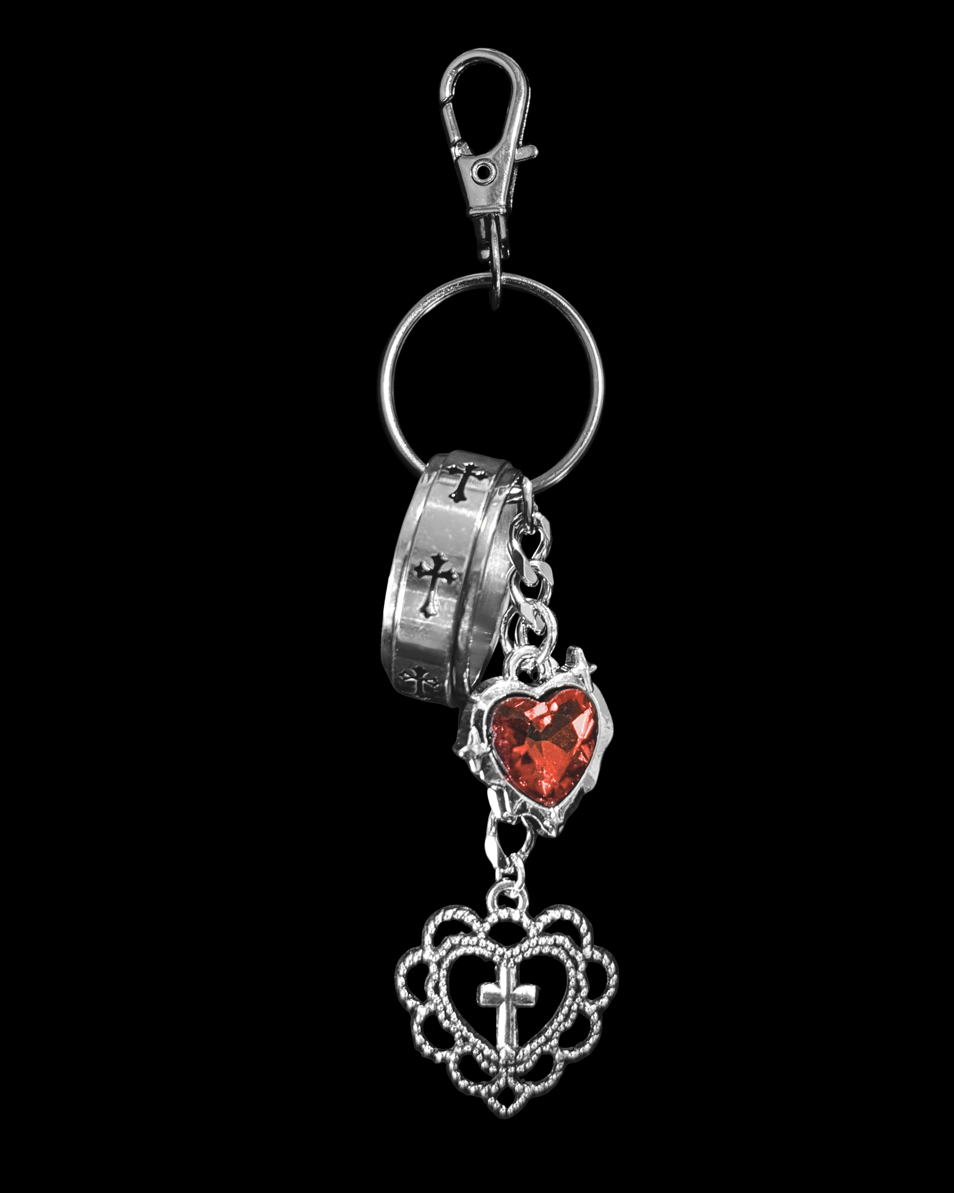 A belt charm featuring a cross-engraved ring connected to a red crystal heart and vintage cross pendant finale