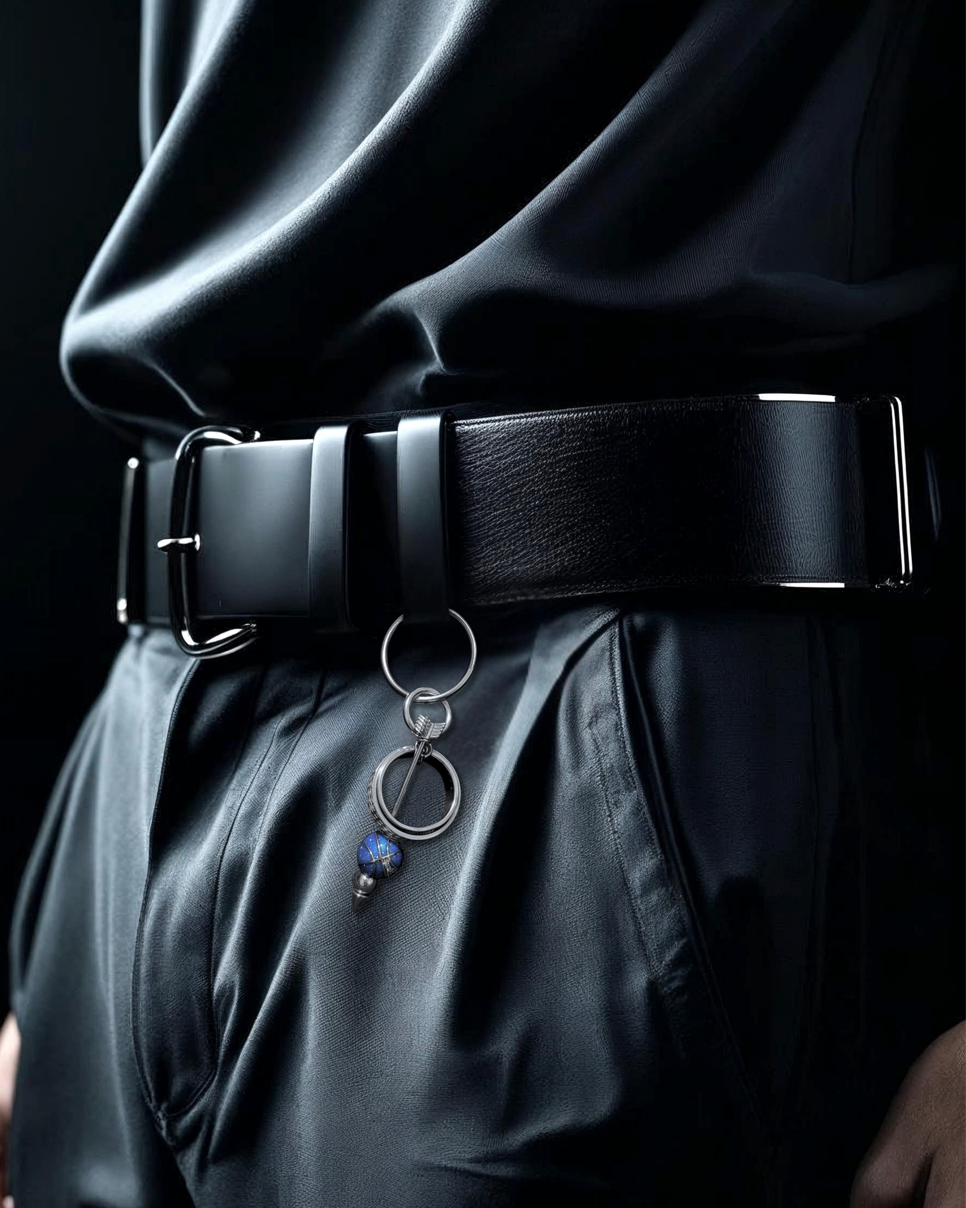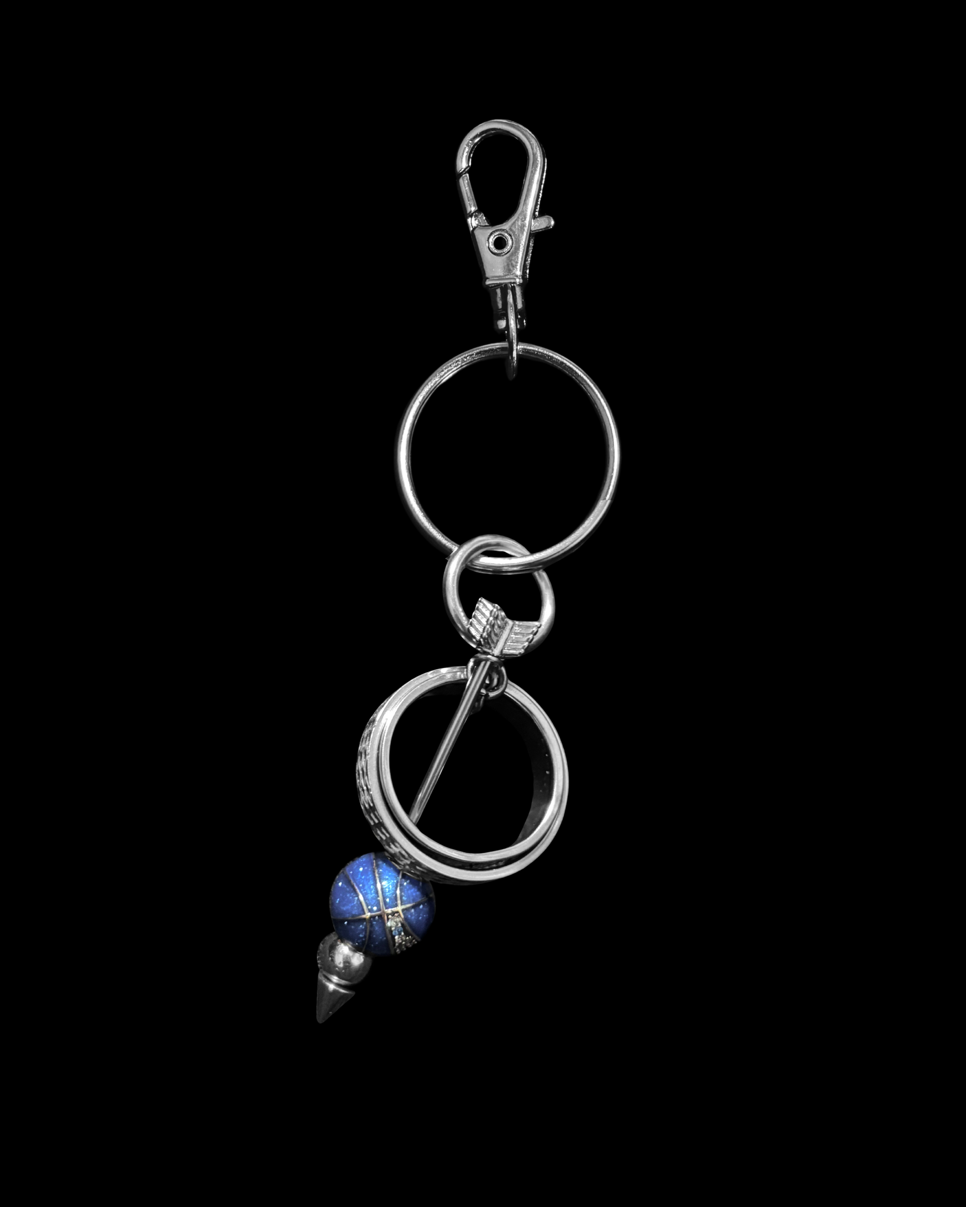 A basketball belt charm with a blue spherical ball piercing through a geometric ring