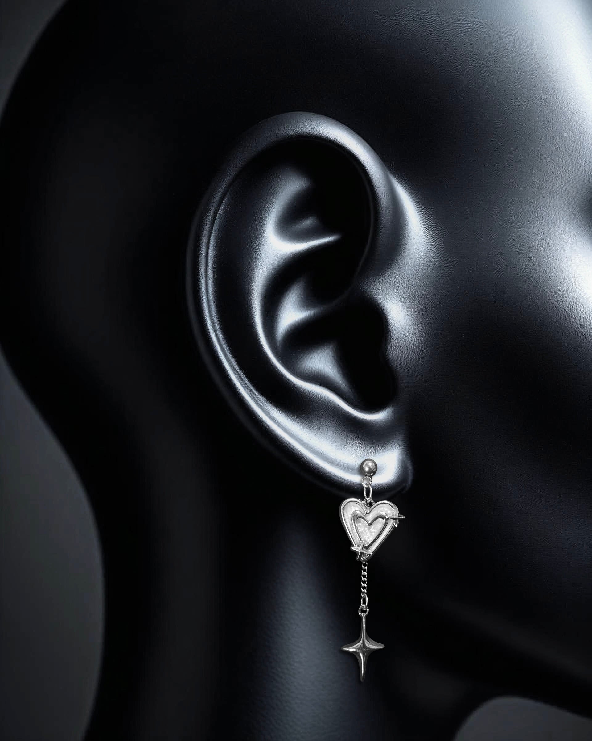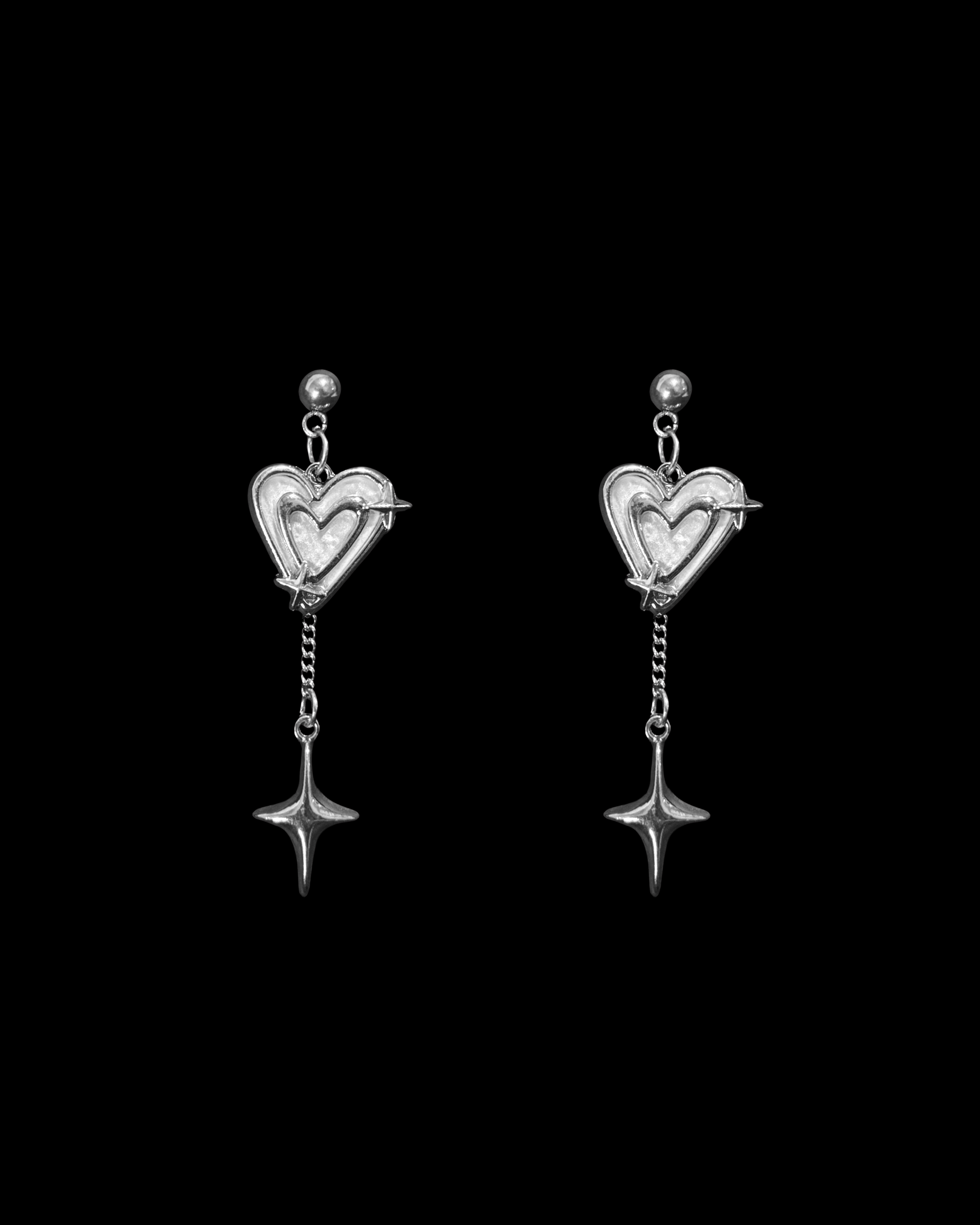 Edgy silver earrings with white heart charms connected to four-pointed star drops