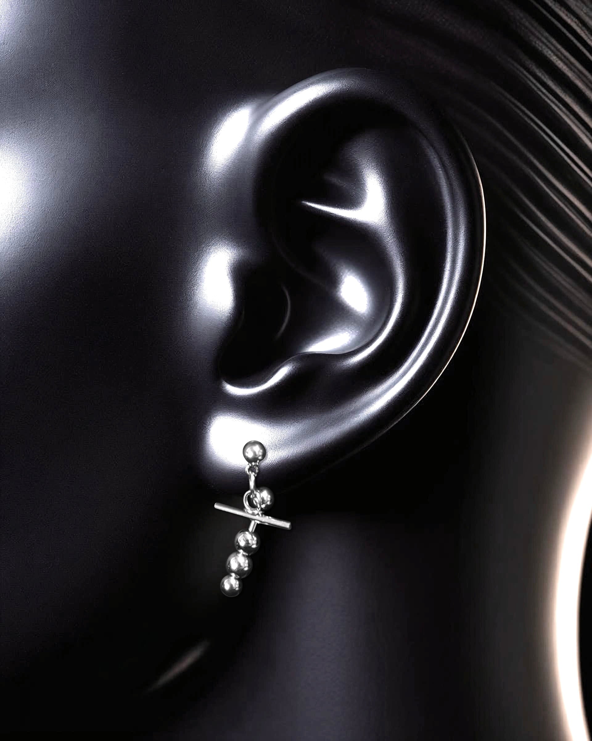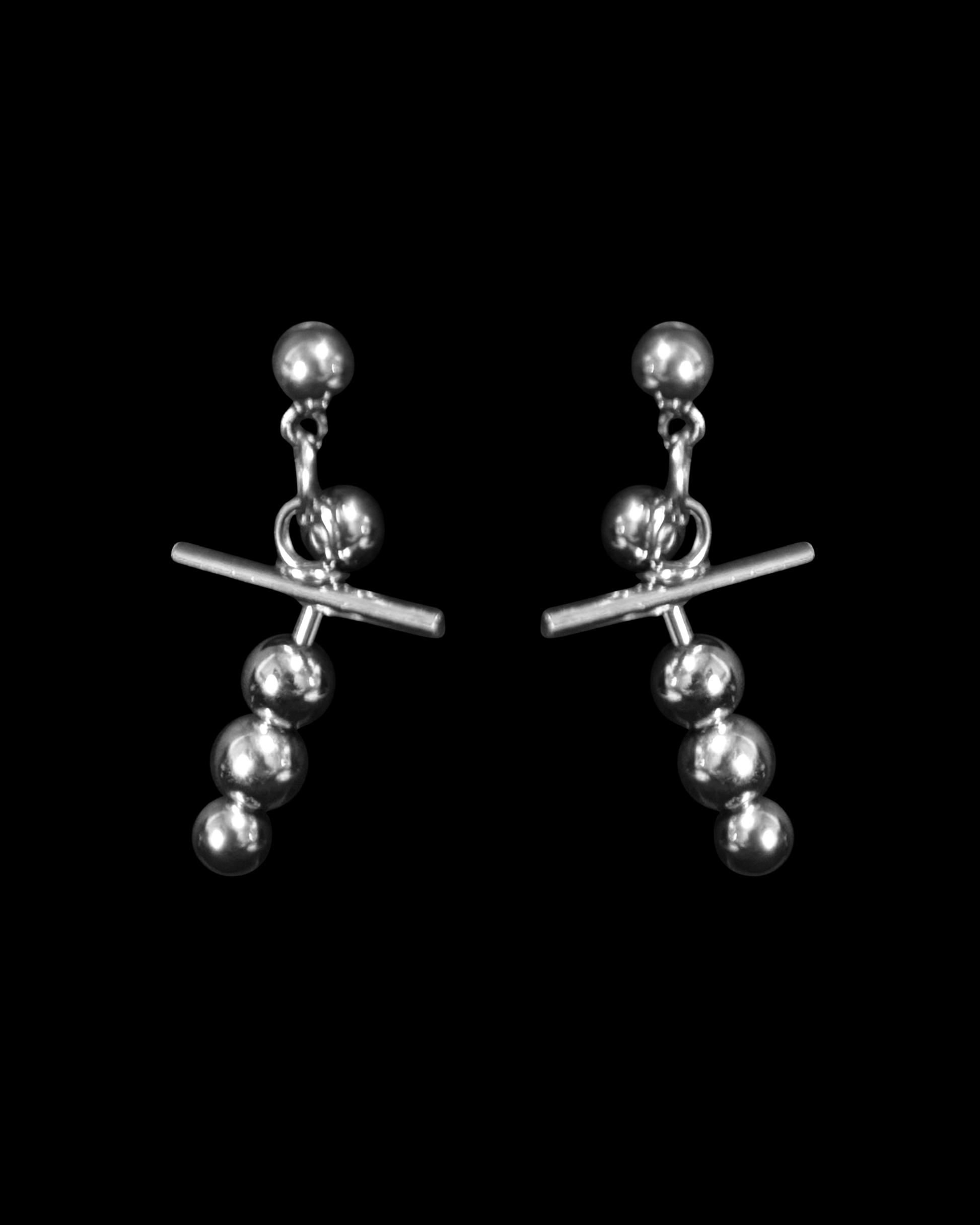 Industrial silver earrings with multiple sphere beads and bar toggle clasps