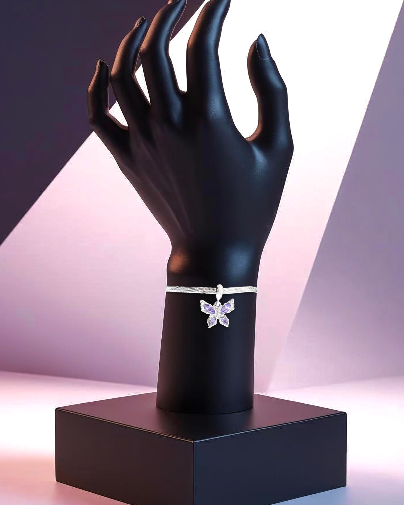 Delicate silk chain featuring an iridescent dark grape purple butterfly pendant