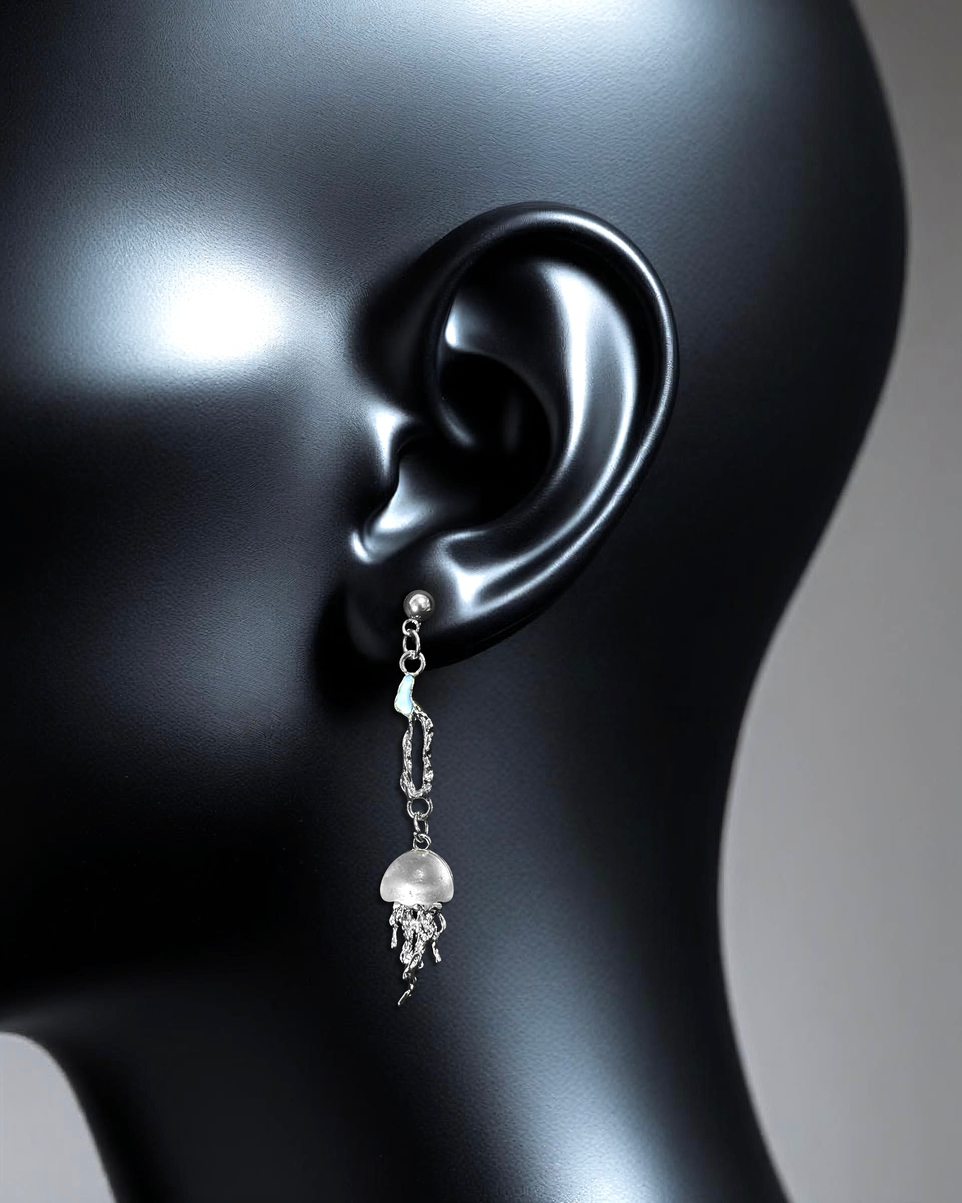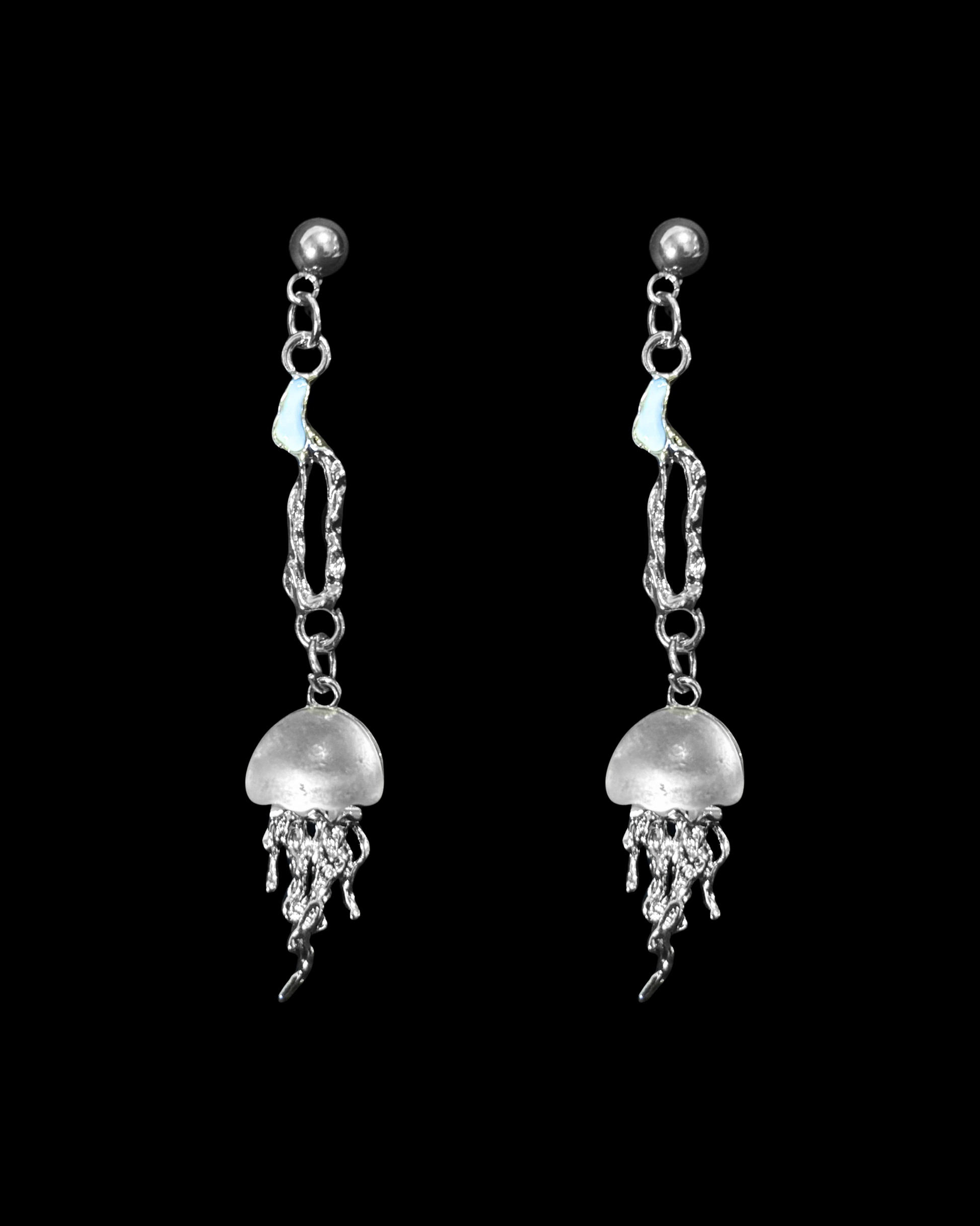 Oceanic silver earrings with blue twisted elements connecting to frosted jellyfish charms