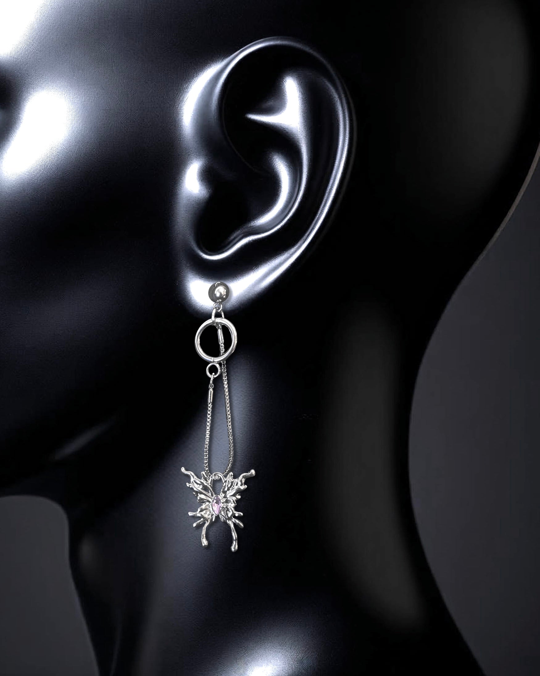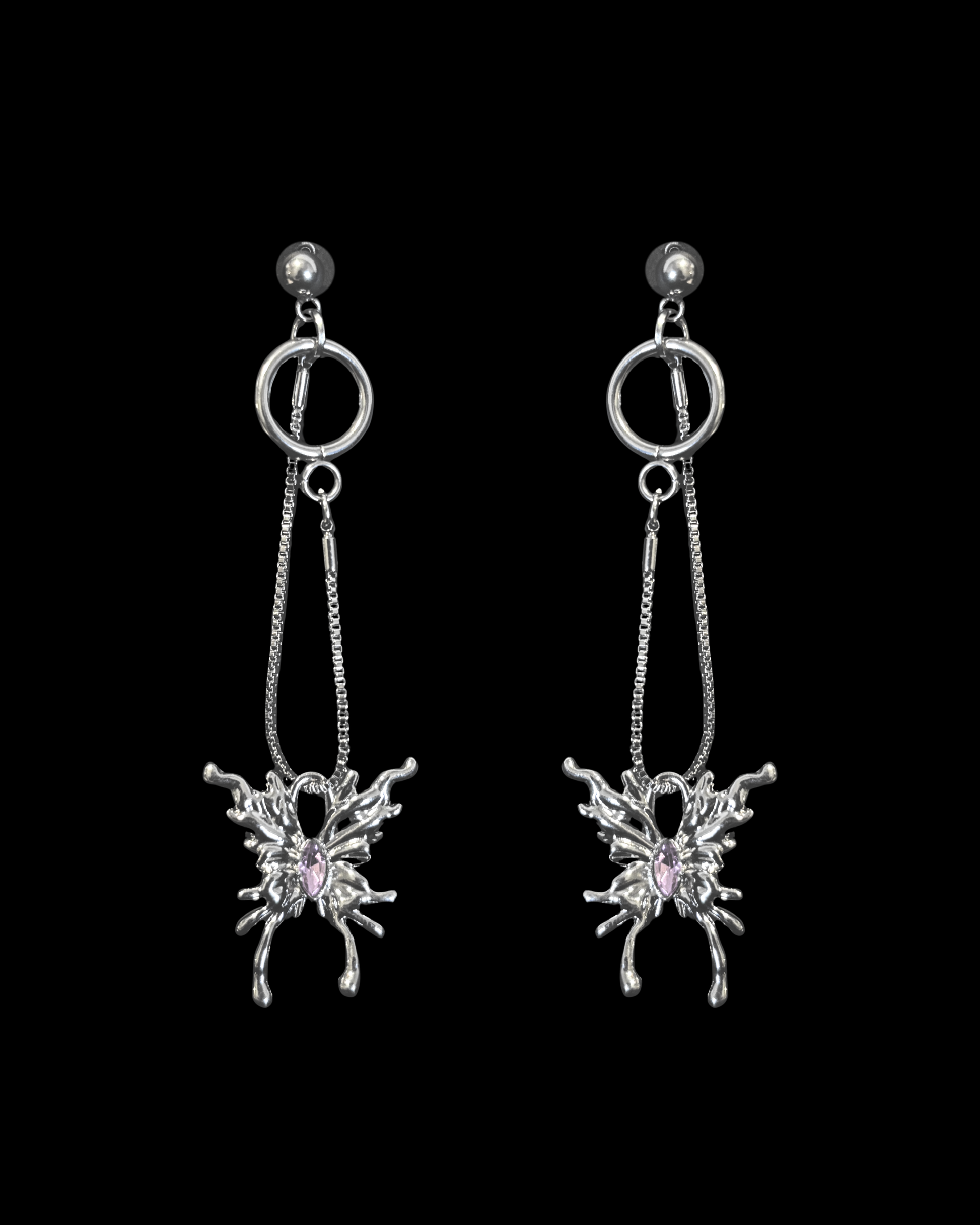 Intricate silver chain earrings featuring circular hoops flowing to pink crystal wing charms