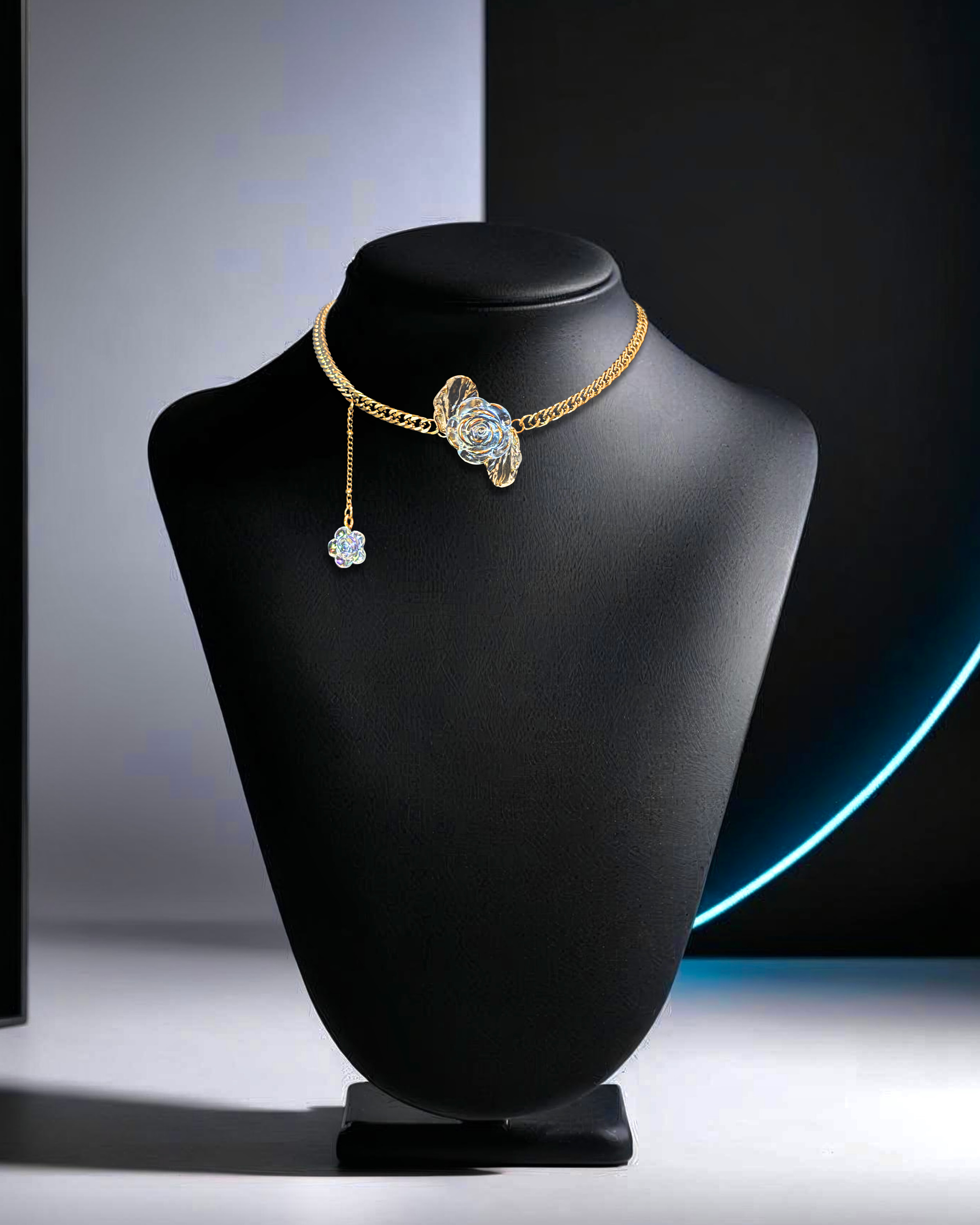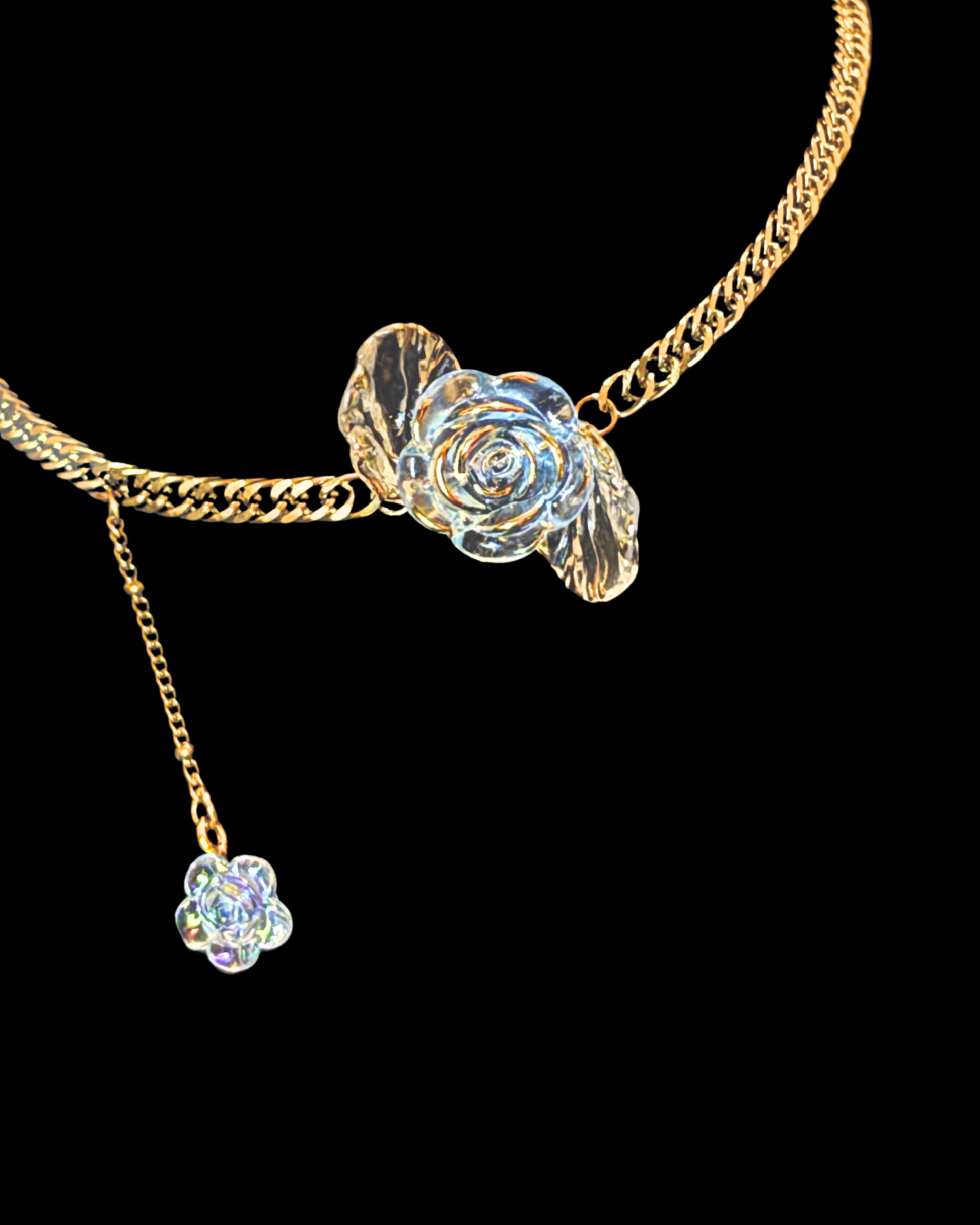 Delicate, glassy rose pendant with its sparkling crystal drop