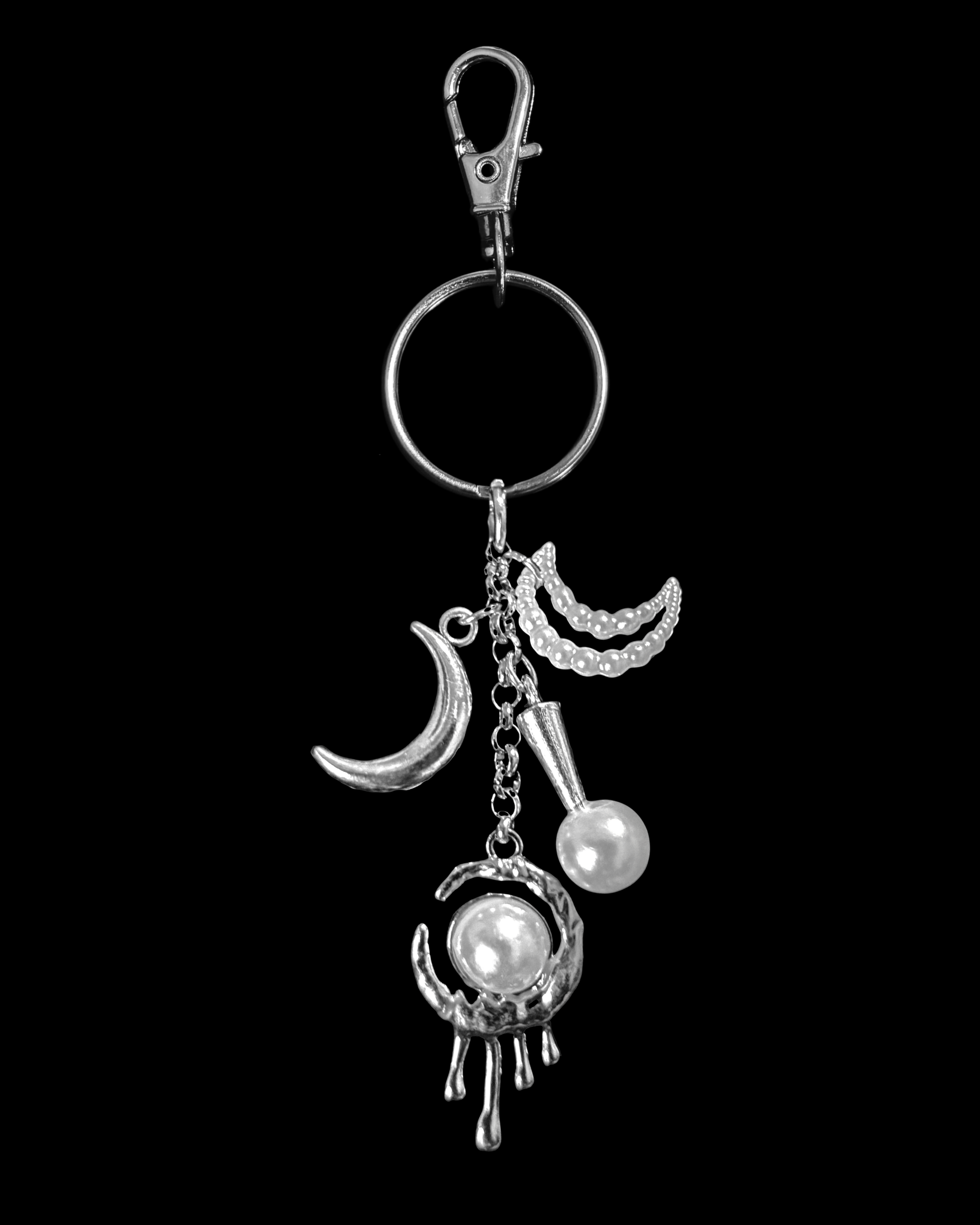 A belt charm with multiple crescent moons, pearl spheres, and dripping elements