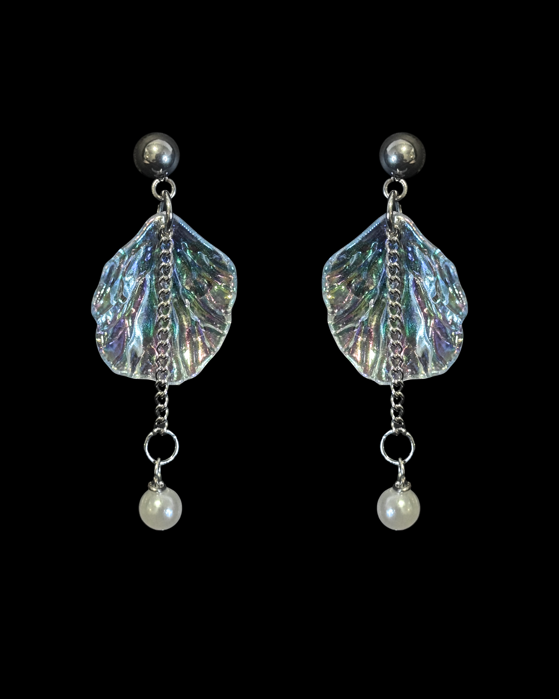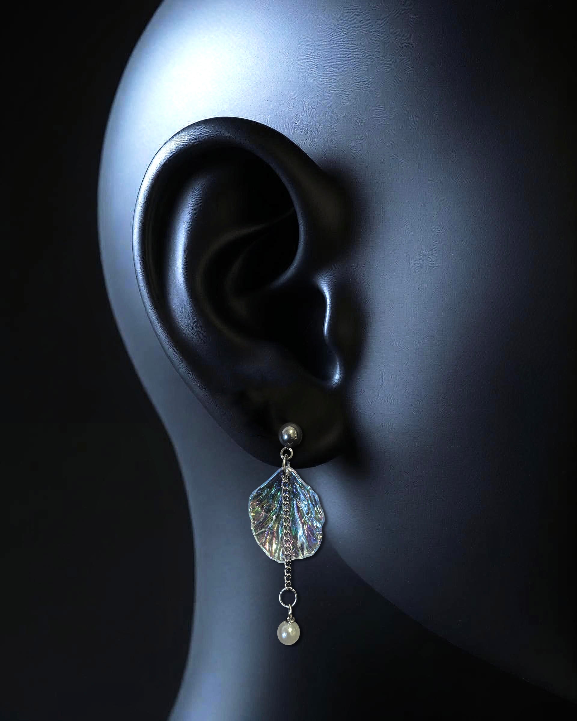 Ethereal earrings featuring iridescent leaf pendants with delicate chain details and pearl drops