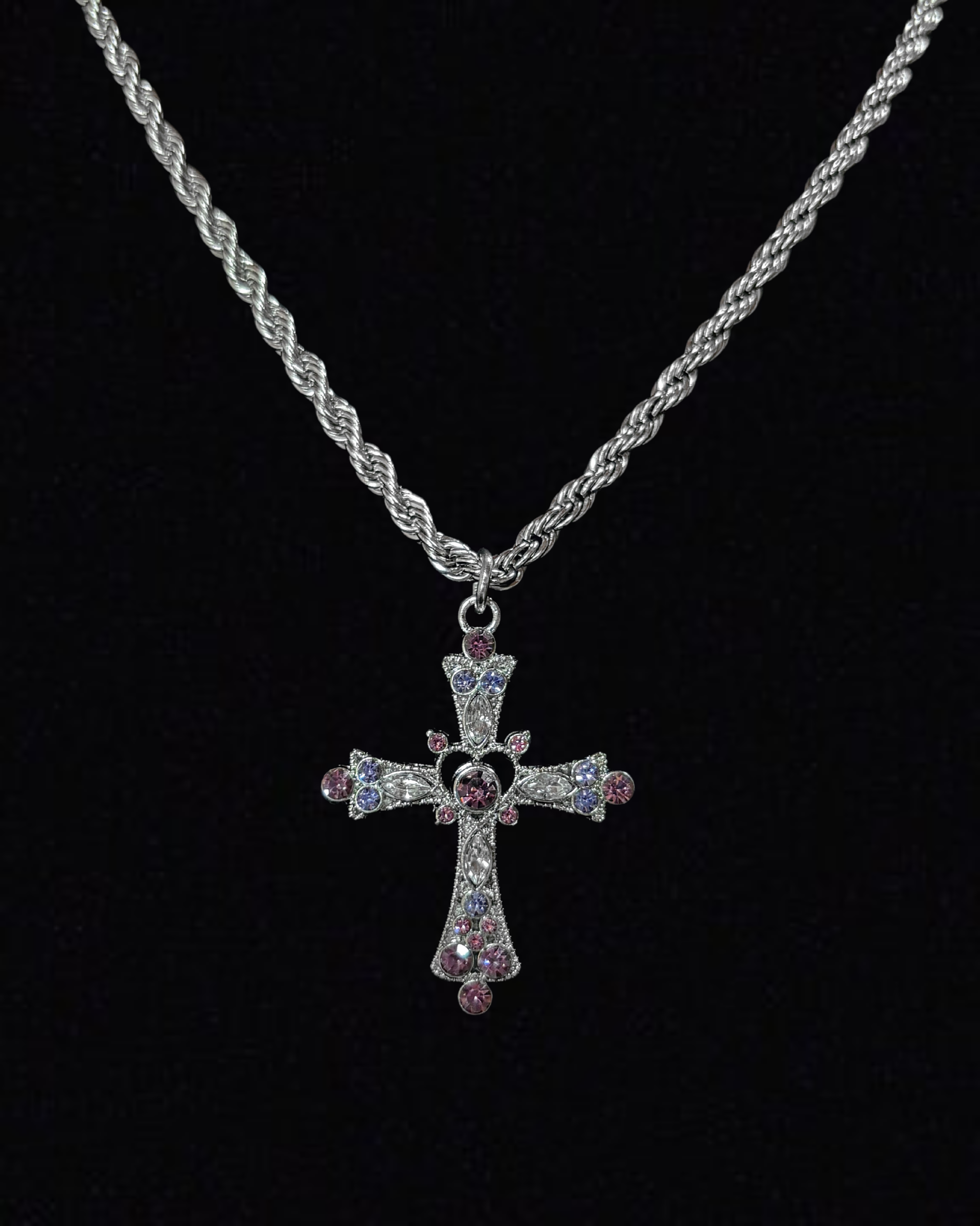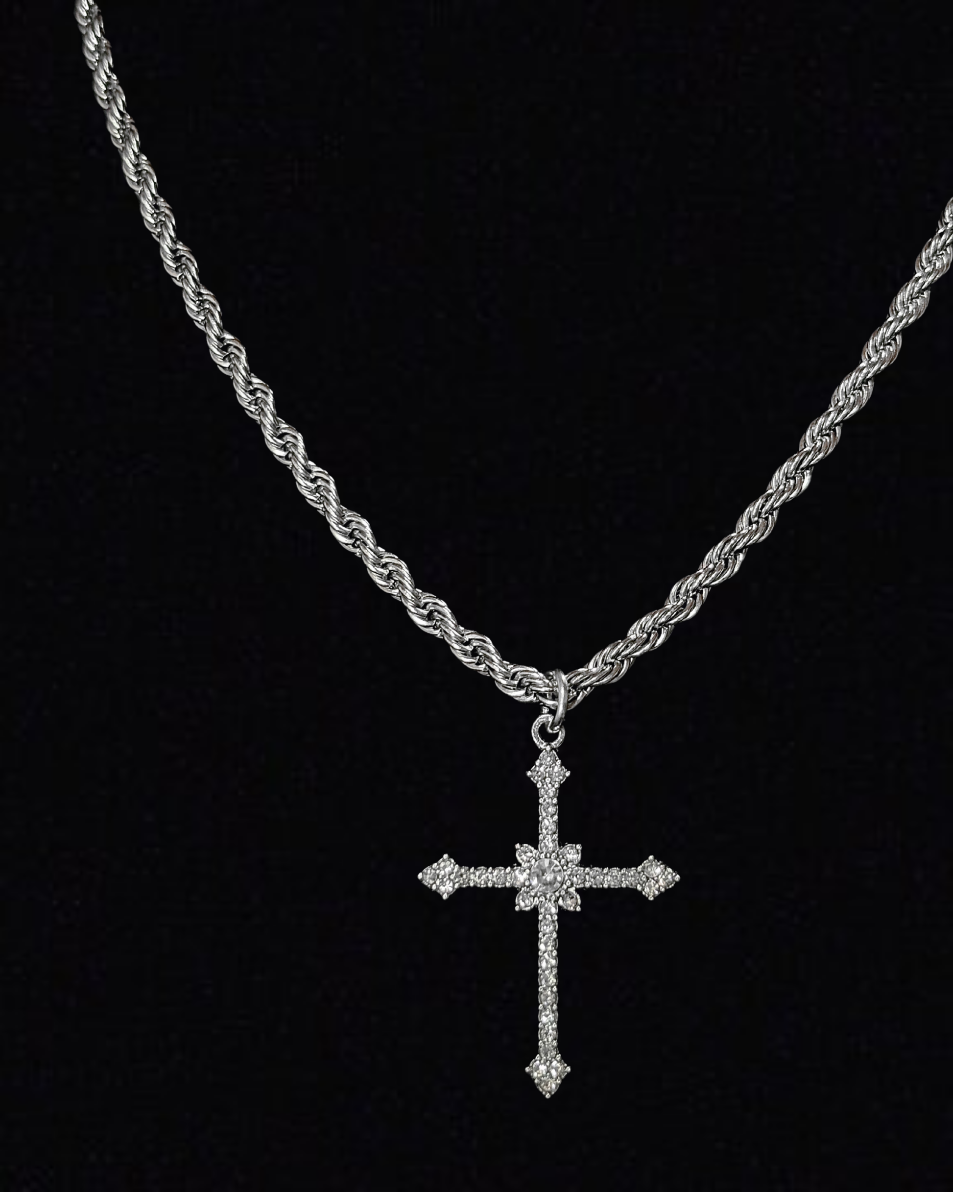 Rope chain with ornate filigree cross pendant. Gothic grandeur meets modern luxury.
