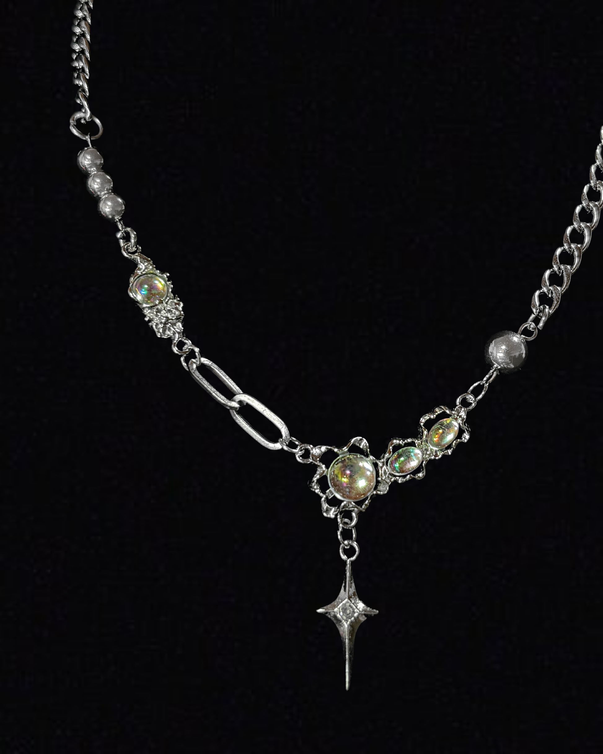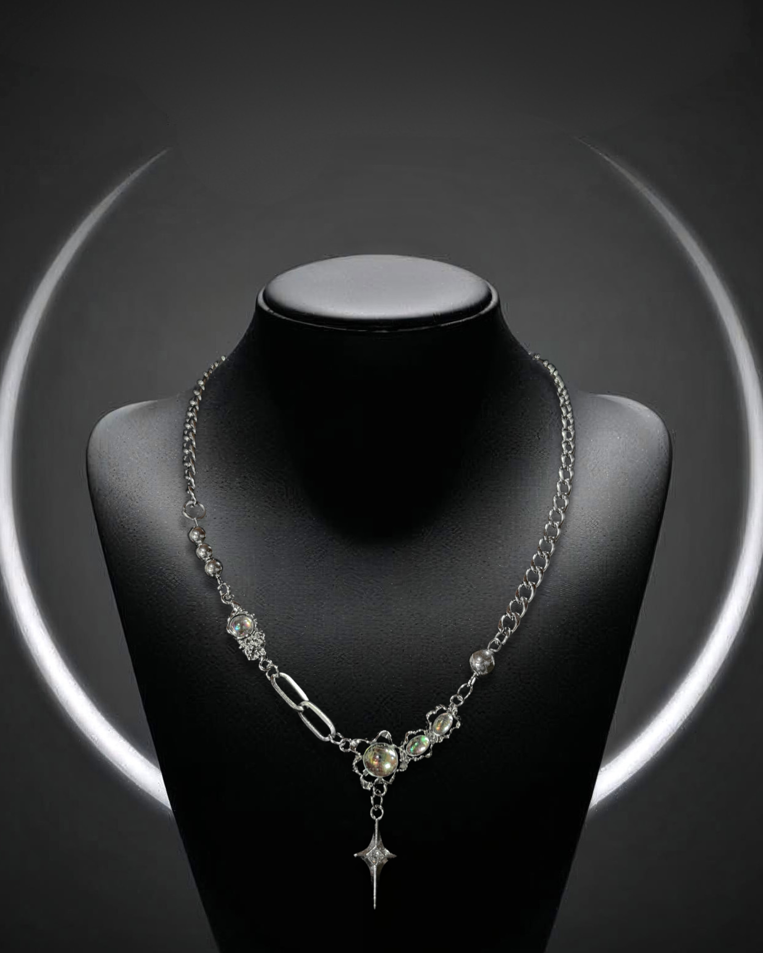 Star pendant chain with geometric spheres and metallic charms. Metallic luxury, pure sophistication.