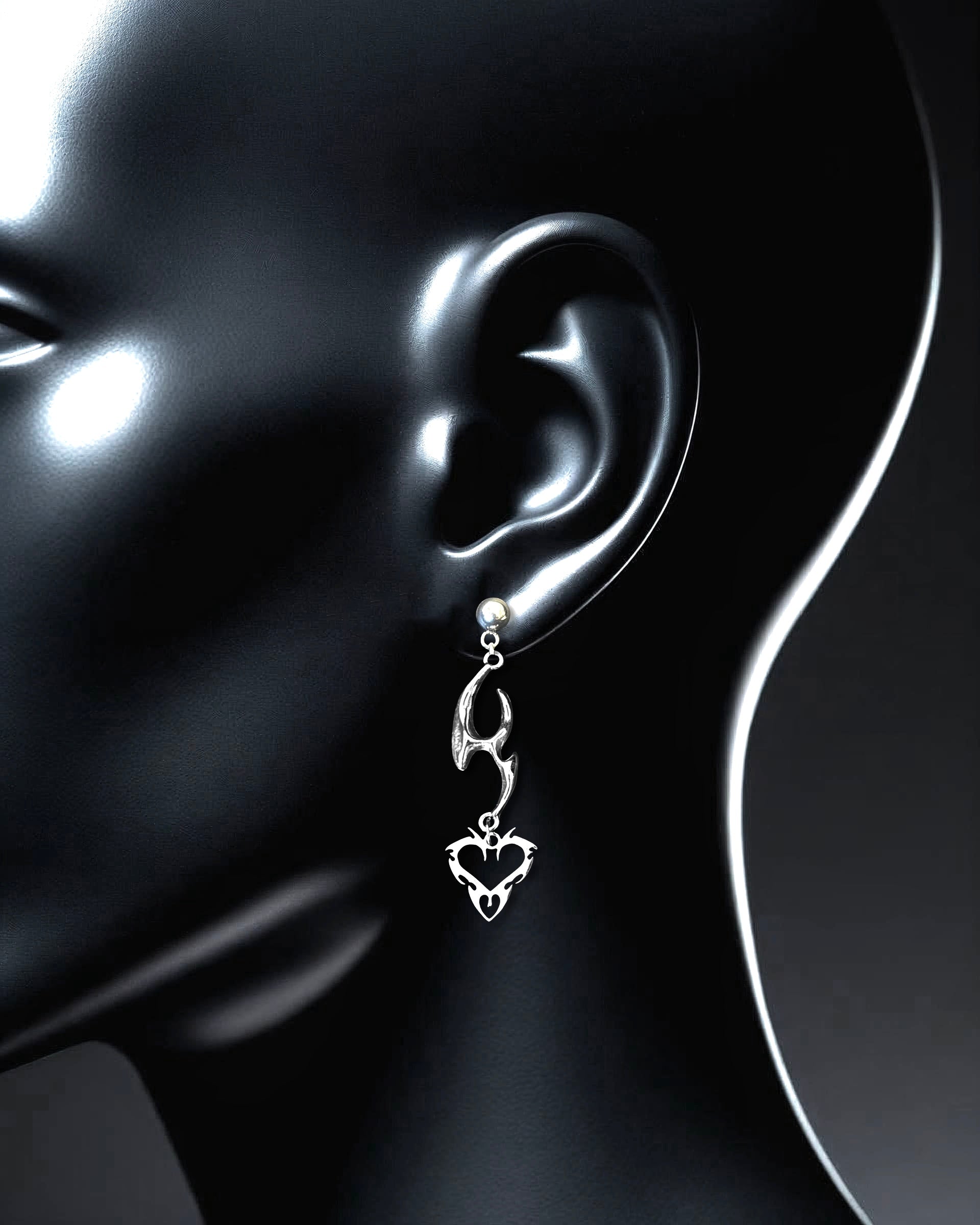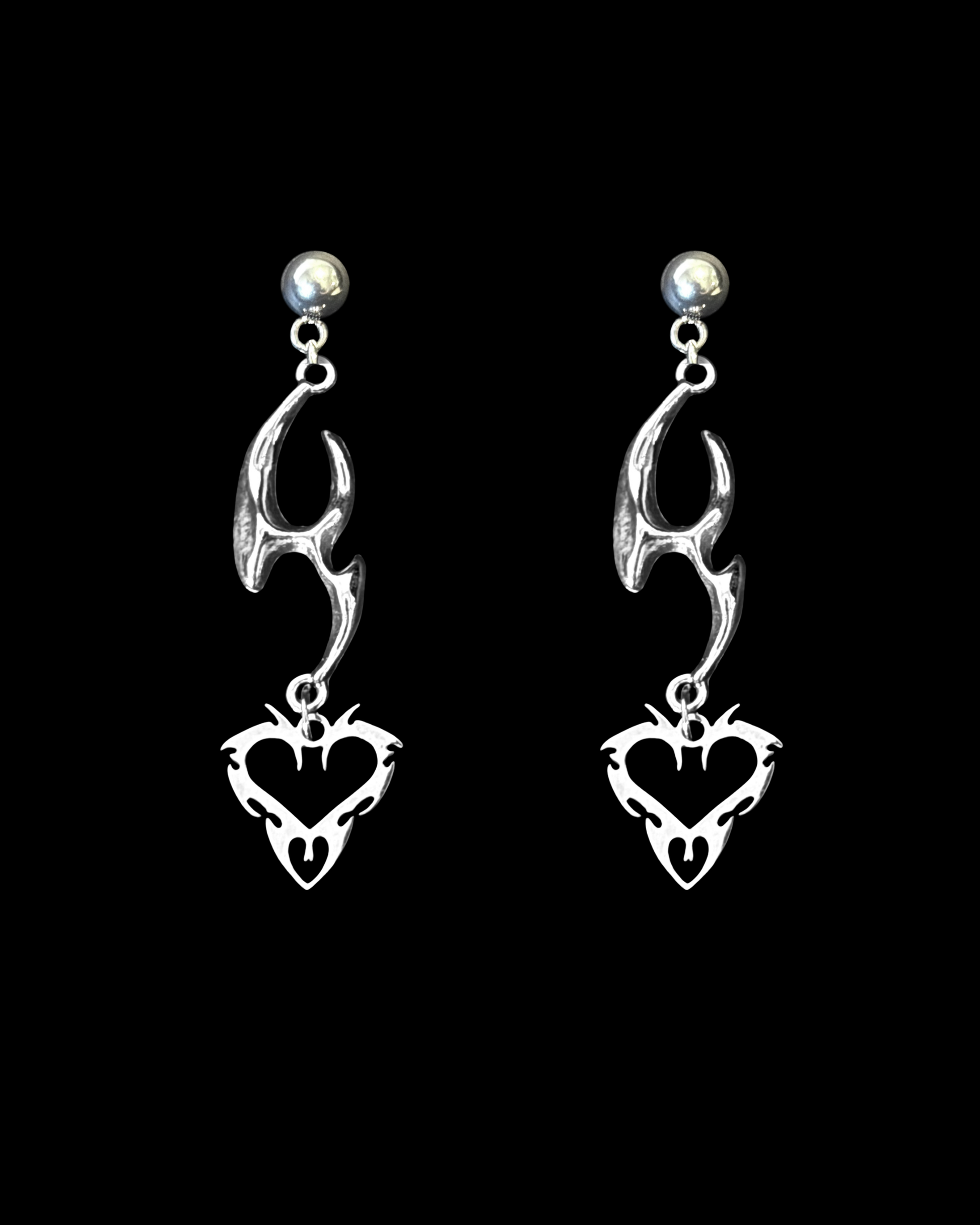 Bold silver earrings featuring curved horns connected to metallic heart pendants
