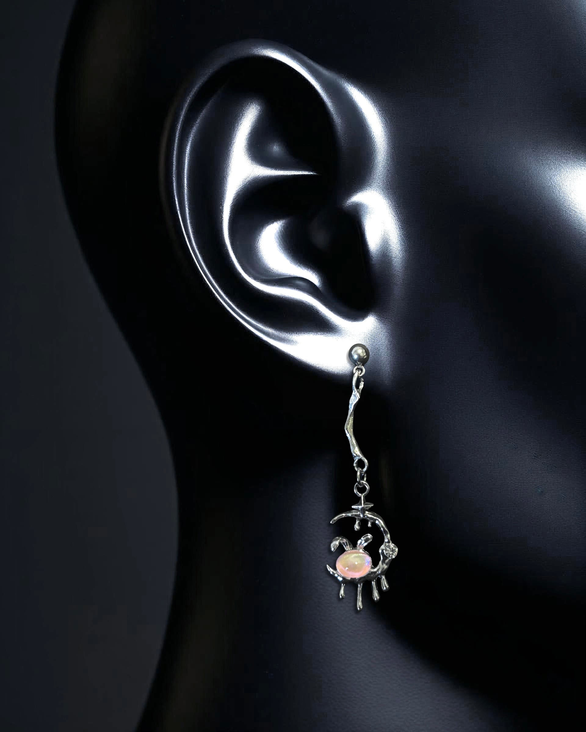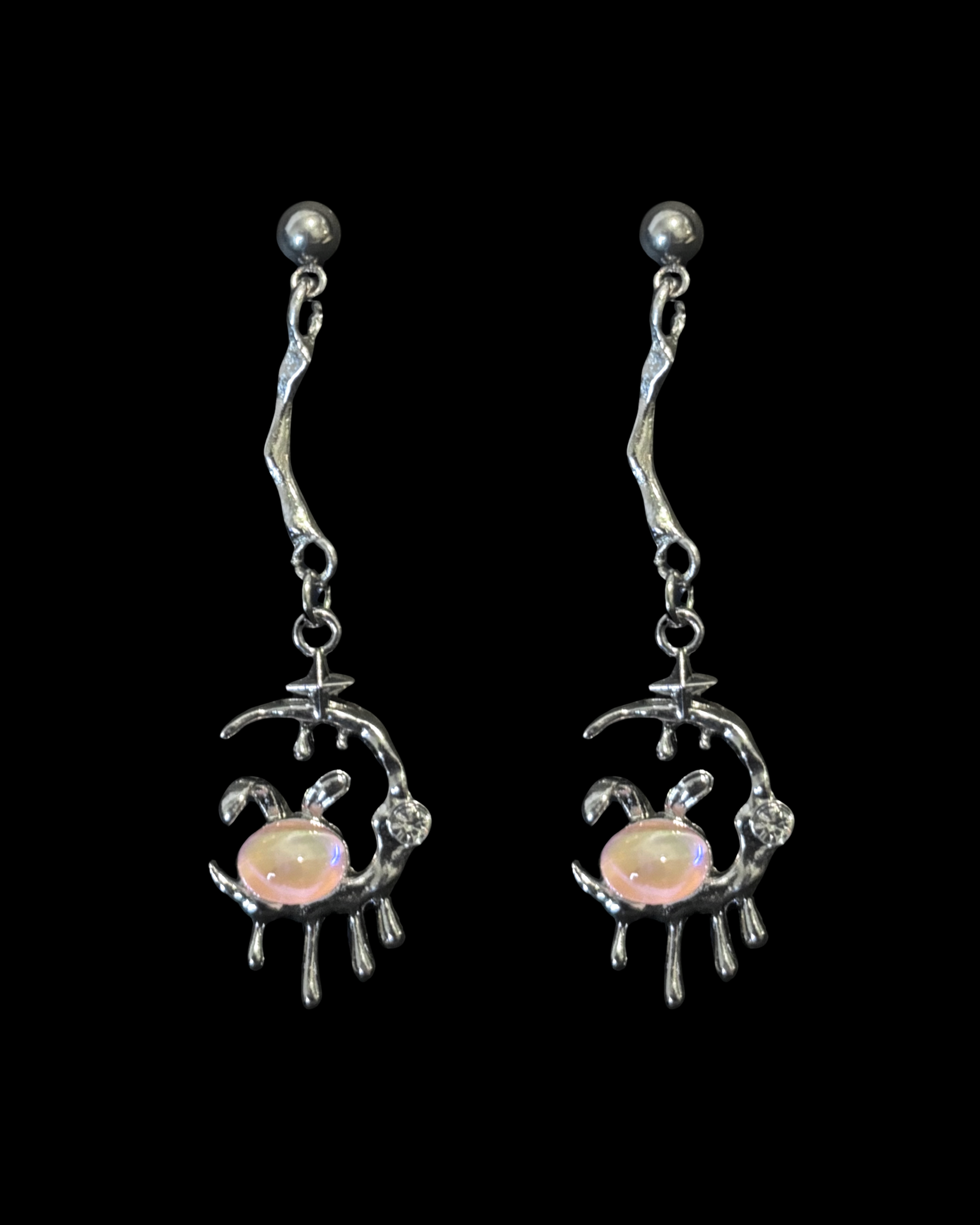 Mystical silver twisted branch earrings with pink rabbit charms - Jade Rabbit - East Asian folklore