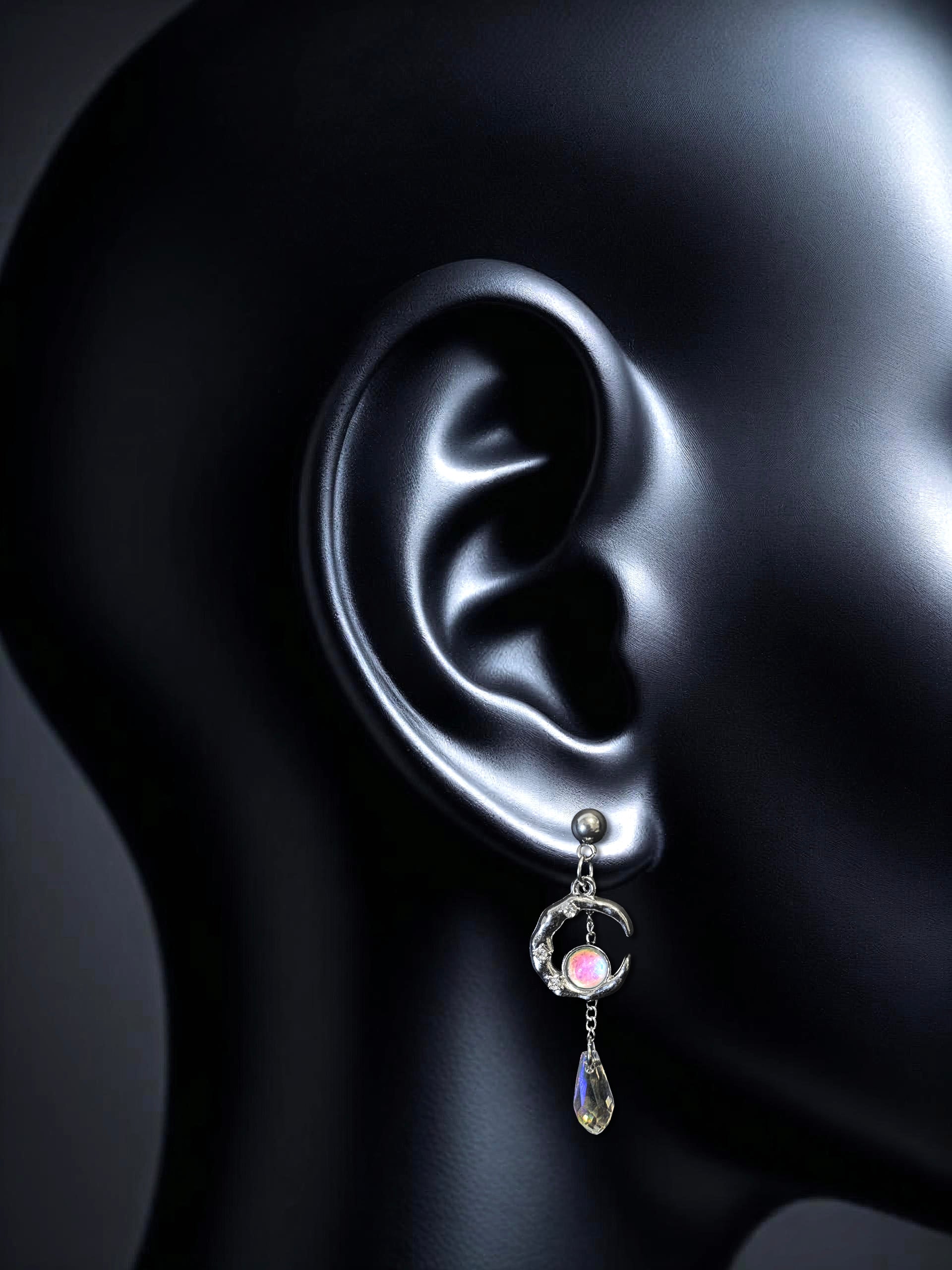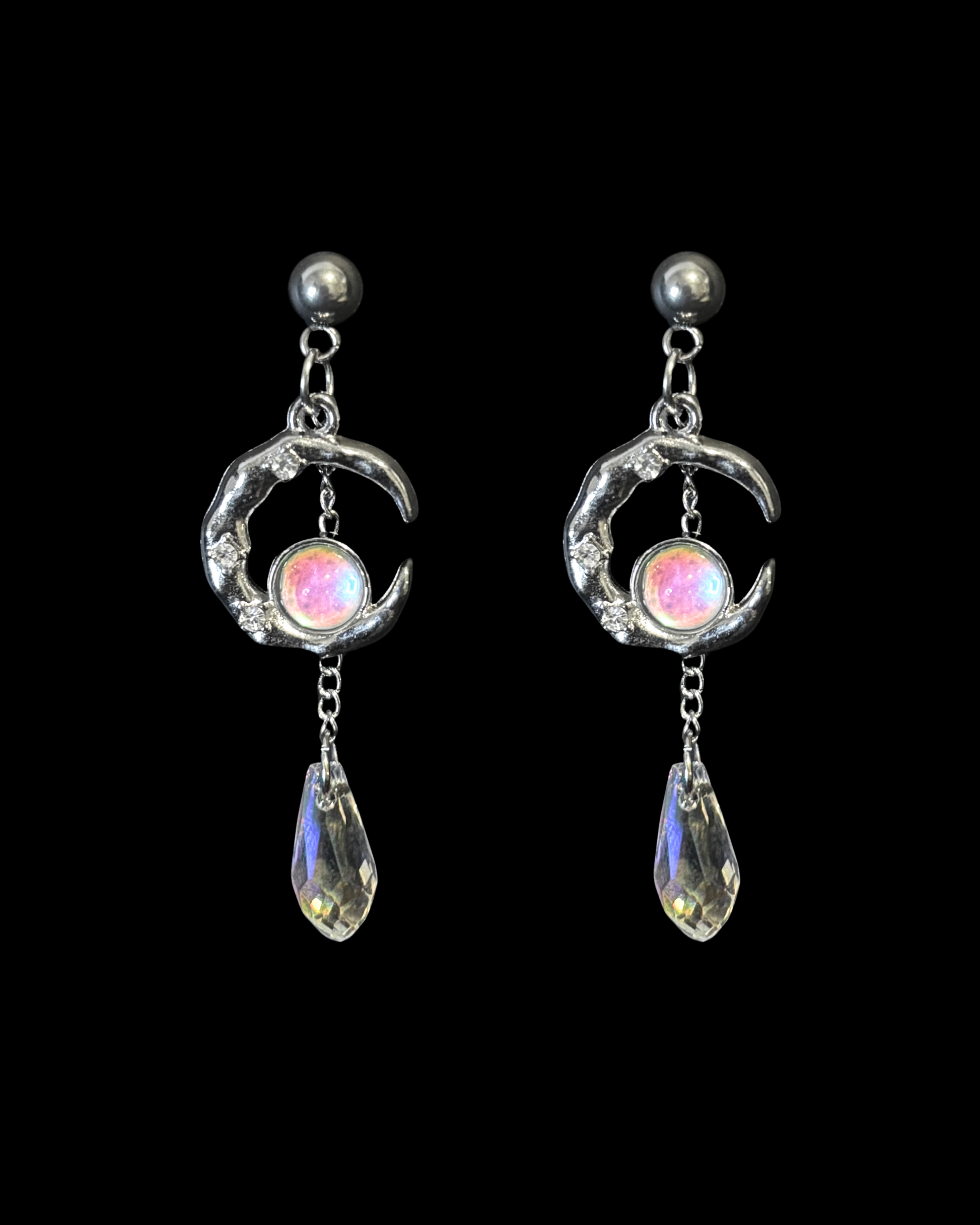 Celestial silver earrings with pink opal crescent moons and crystal teardrops