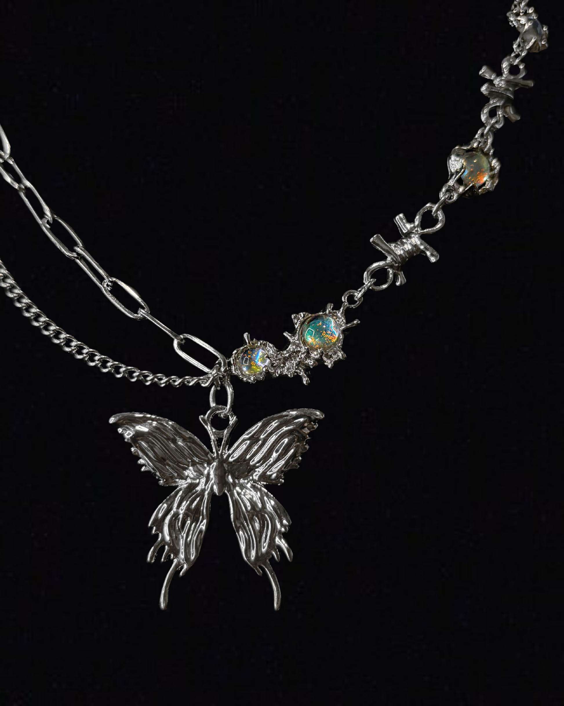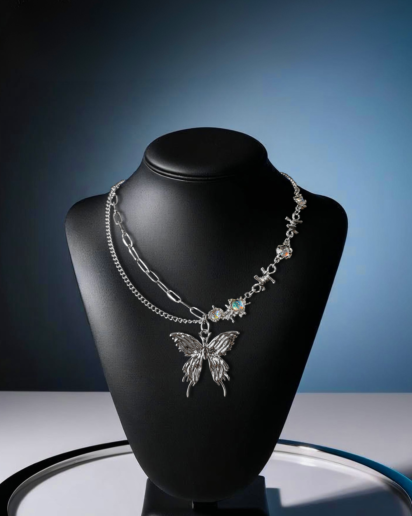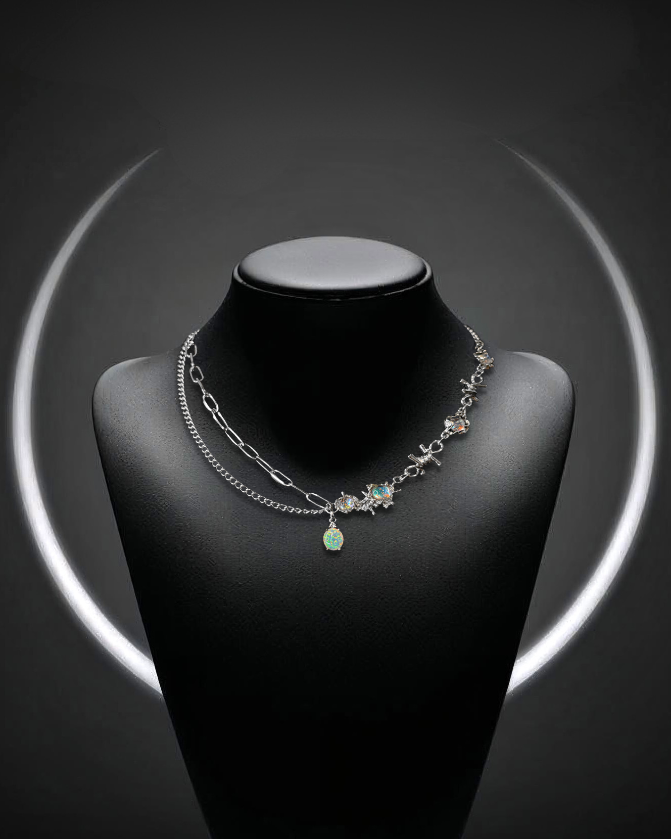 Dual-chain asymmetric necklace with centerpiece and crystal ensemble. Natural transformation captured in metalwork.