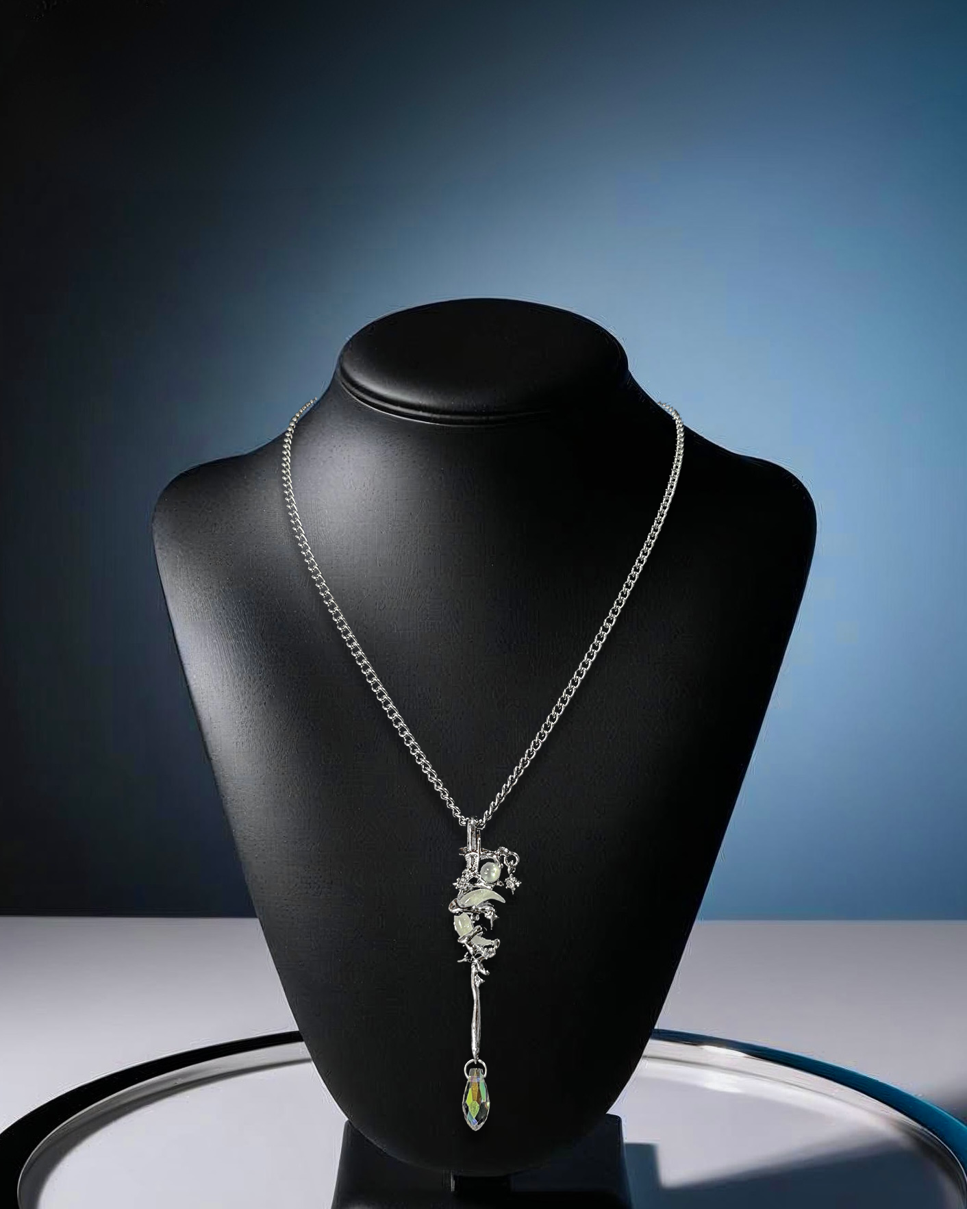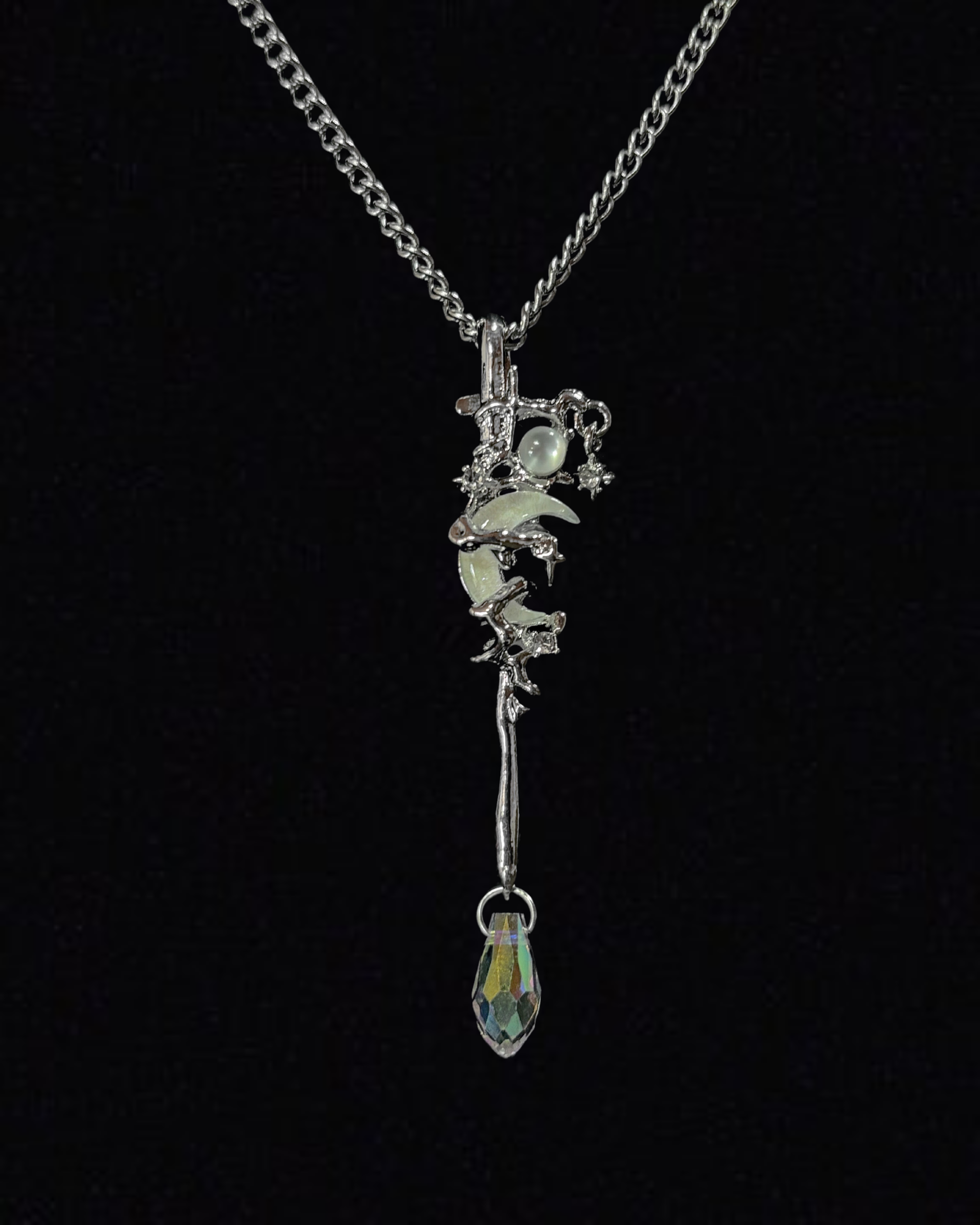 Extended necklace with twisted metal florals and crystal teardrop. Organic luxury meets gravity.
