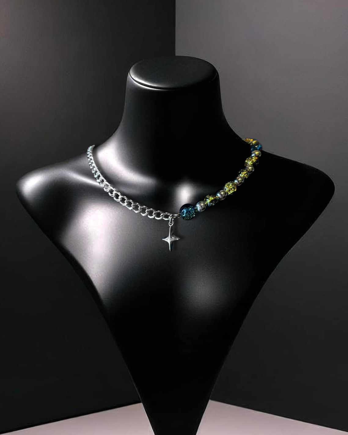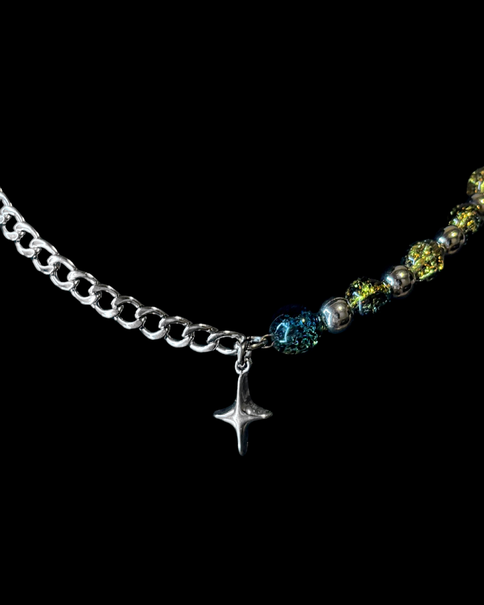 Mixed-chain necklace featuring multi-colored crystal beads and four-pointed star pendant