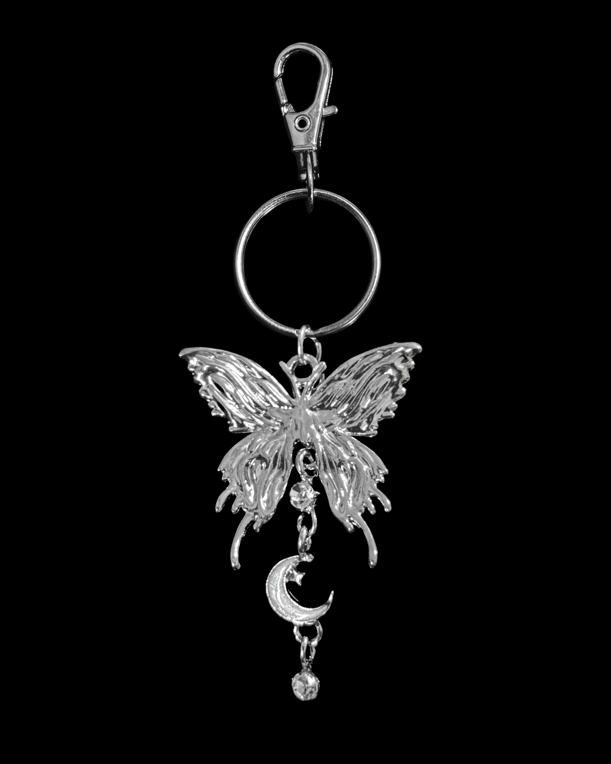 An edgy belt charm featuring an ornate butterfly with a crescent moon and crystal drop