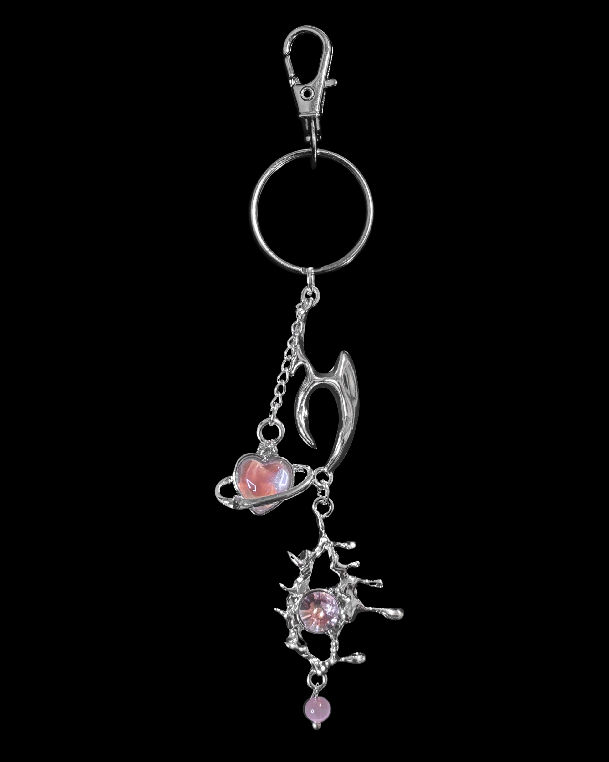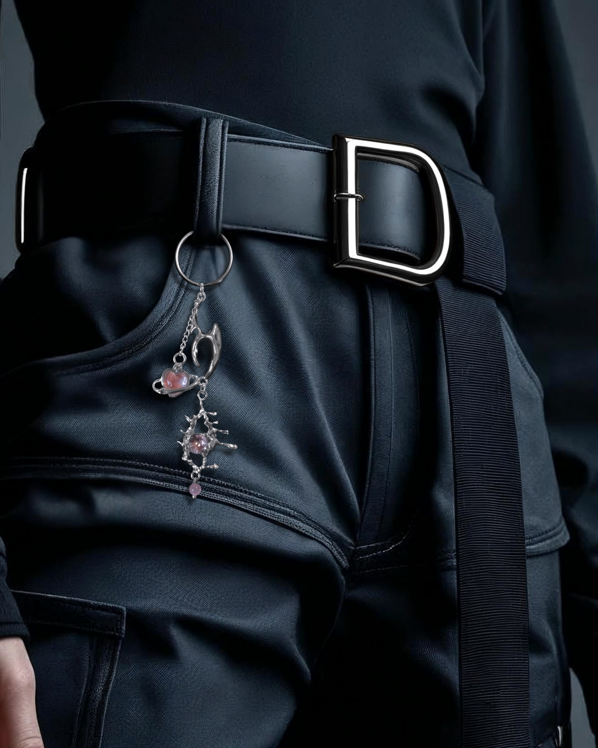 An edgy belt charm showcasing a translucent heart with a spiked eye centerpiece and dangling crystal accent