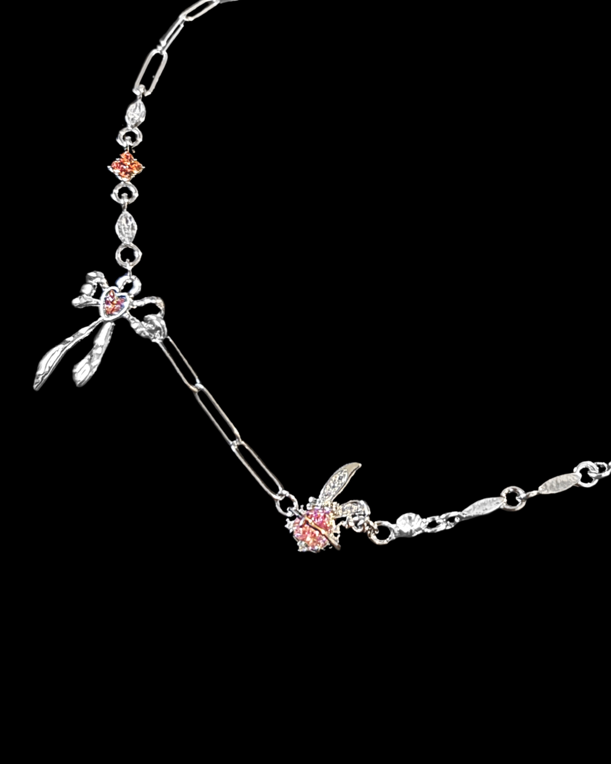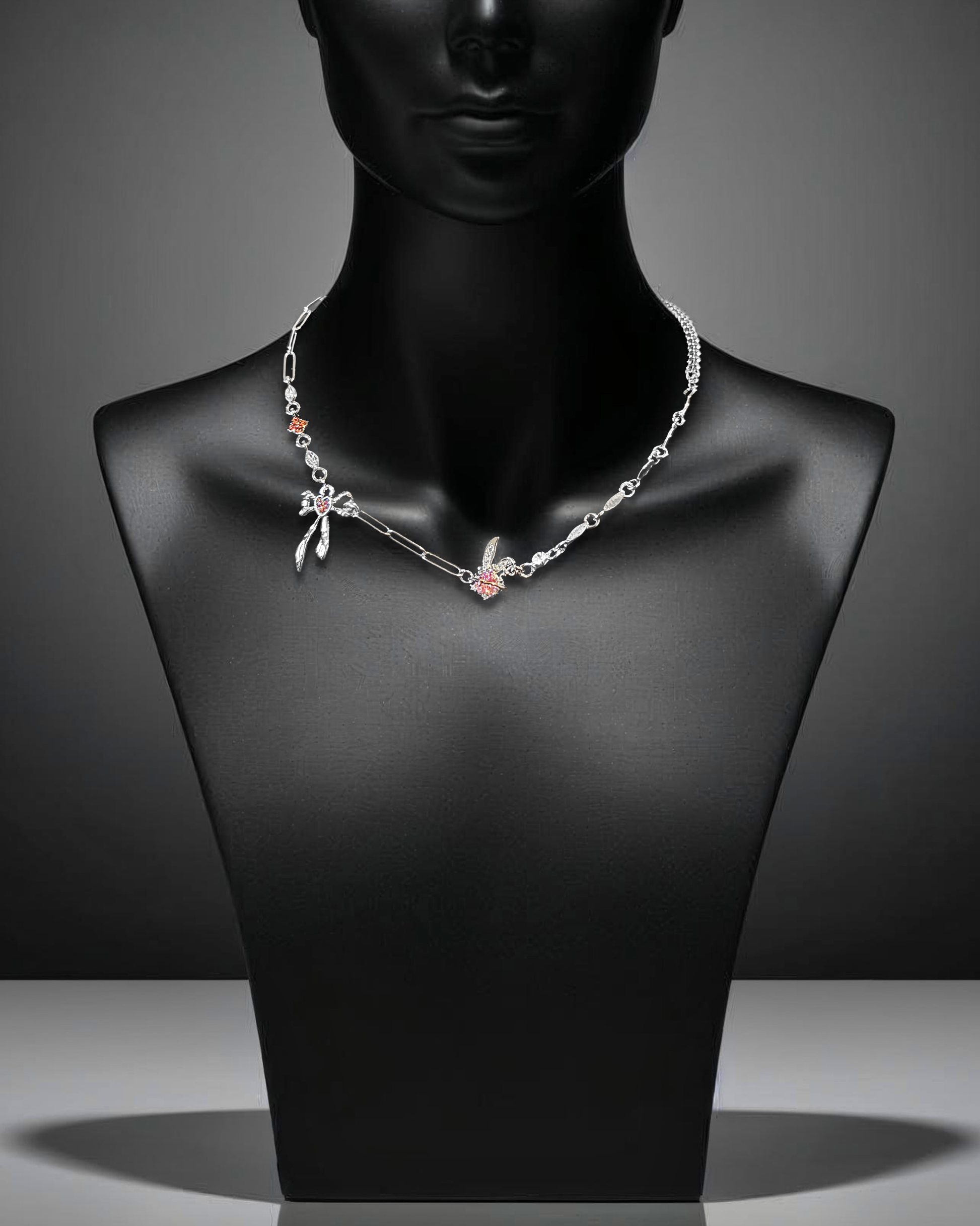 Multi-element chain with scattered pink gems, bow accent and center bunny
