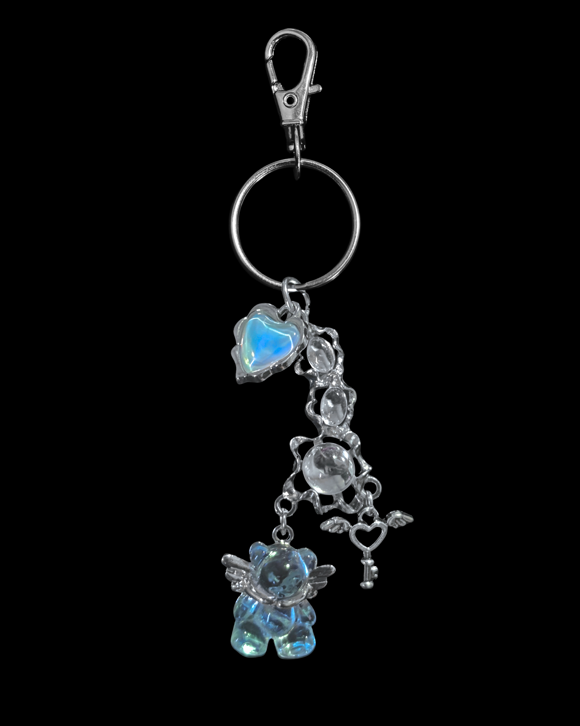 A belt charm with an opalescent heart, crystal elements, and an iridescent teddy bear figure