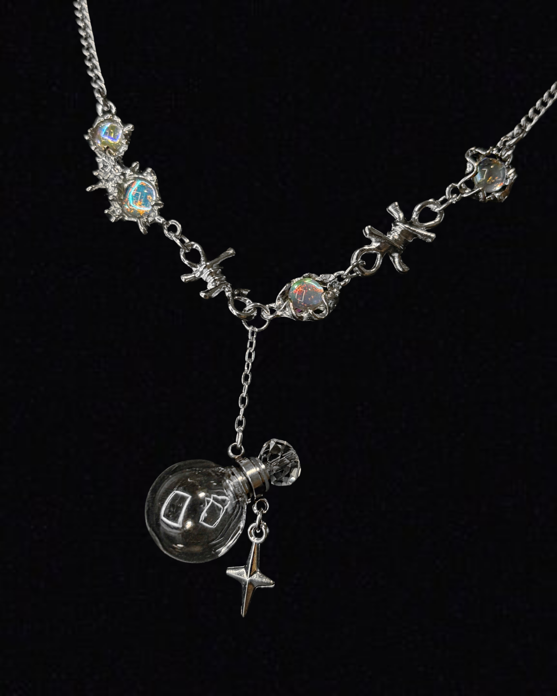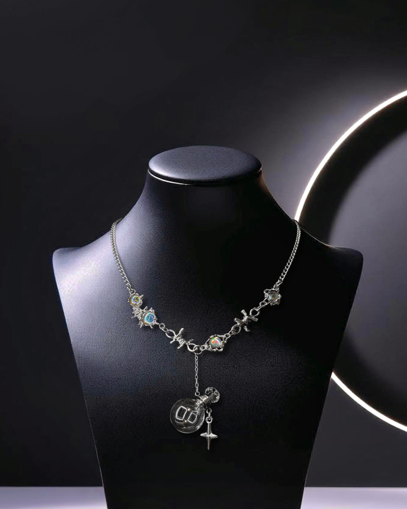 Multi-charm statement piece with geometric pendants and crystal sphere. Sculptural luxury redefined.