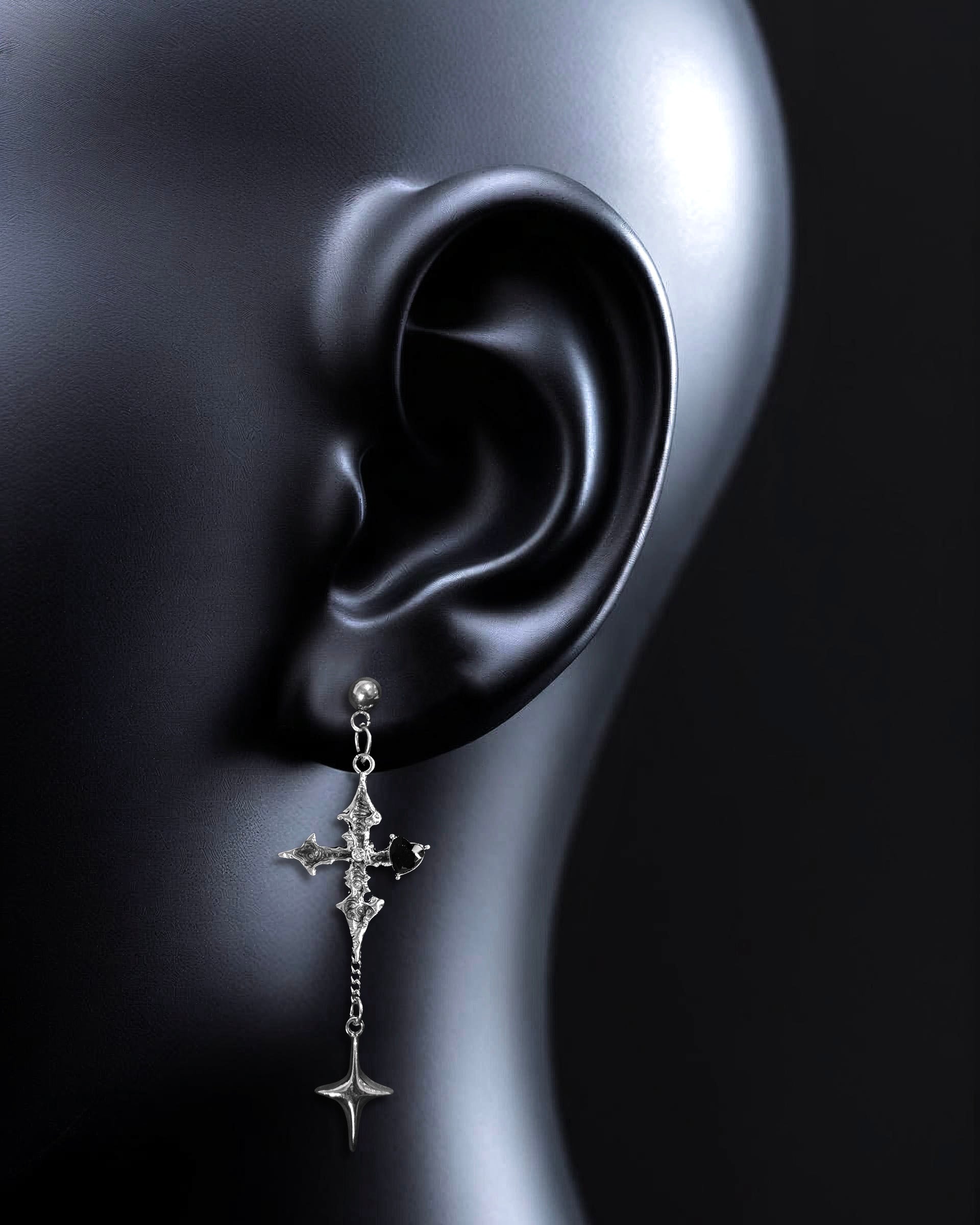 Gothic grey dual cross earrings with ornate details cascading to sharp pointed pendants
