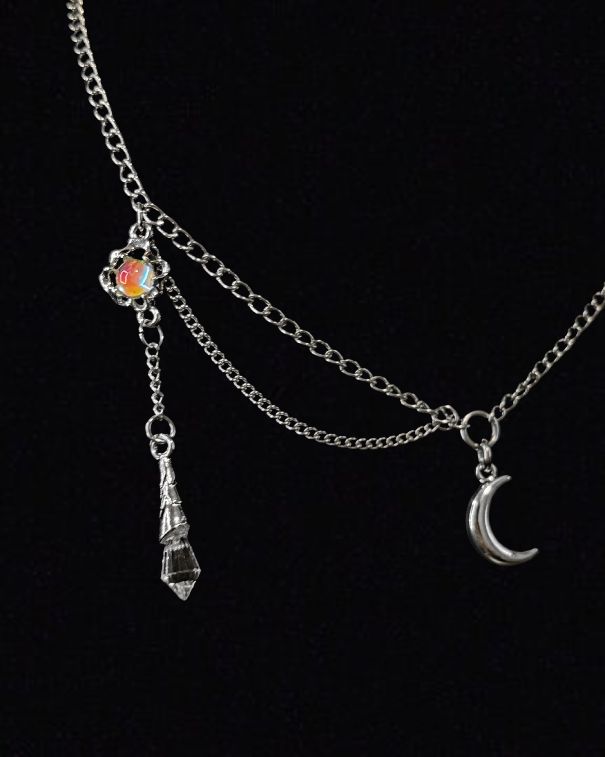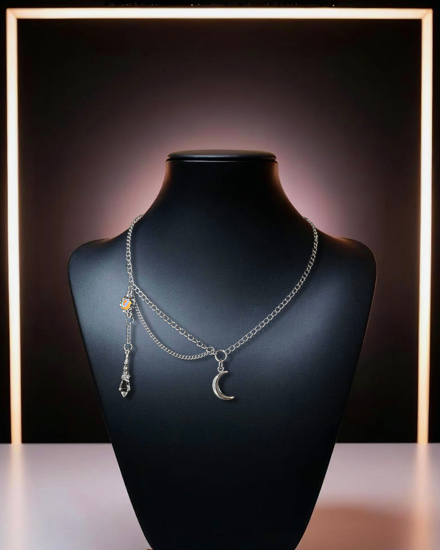 Asymmetric layered necklace with crescent moon and crystal drop. Light and shadow in perfect tension.