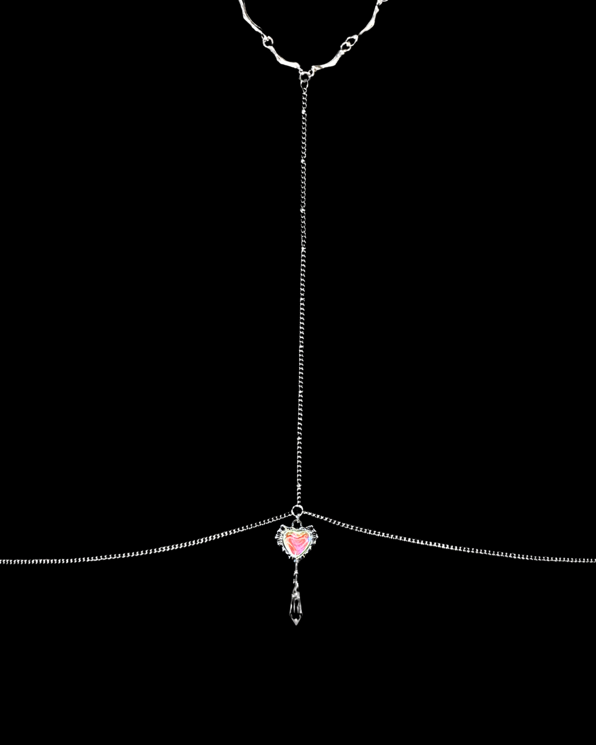 Back : Ethereal pink heart pendant flowing through a spinal chain