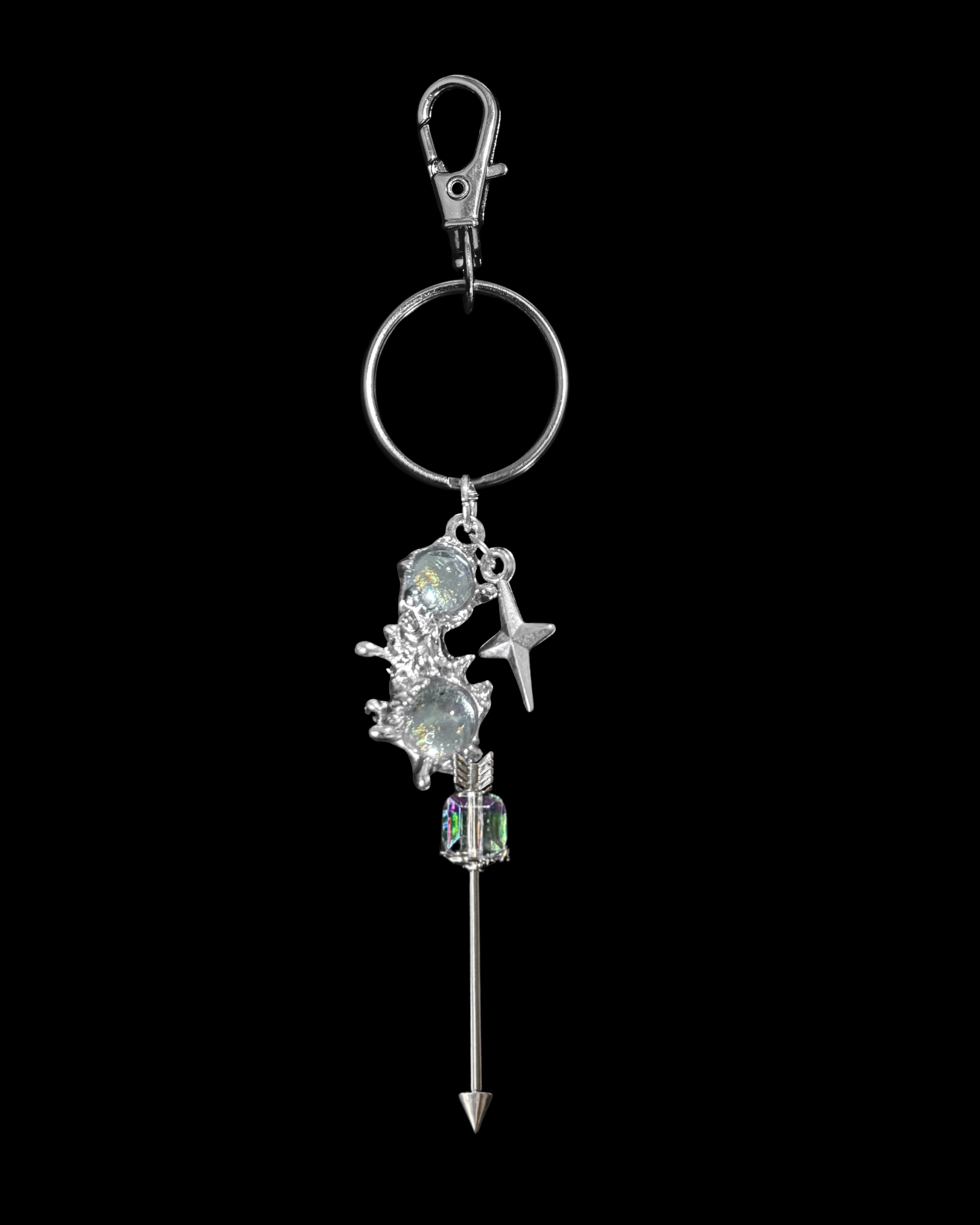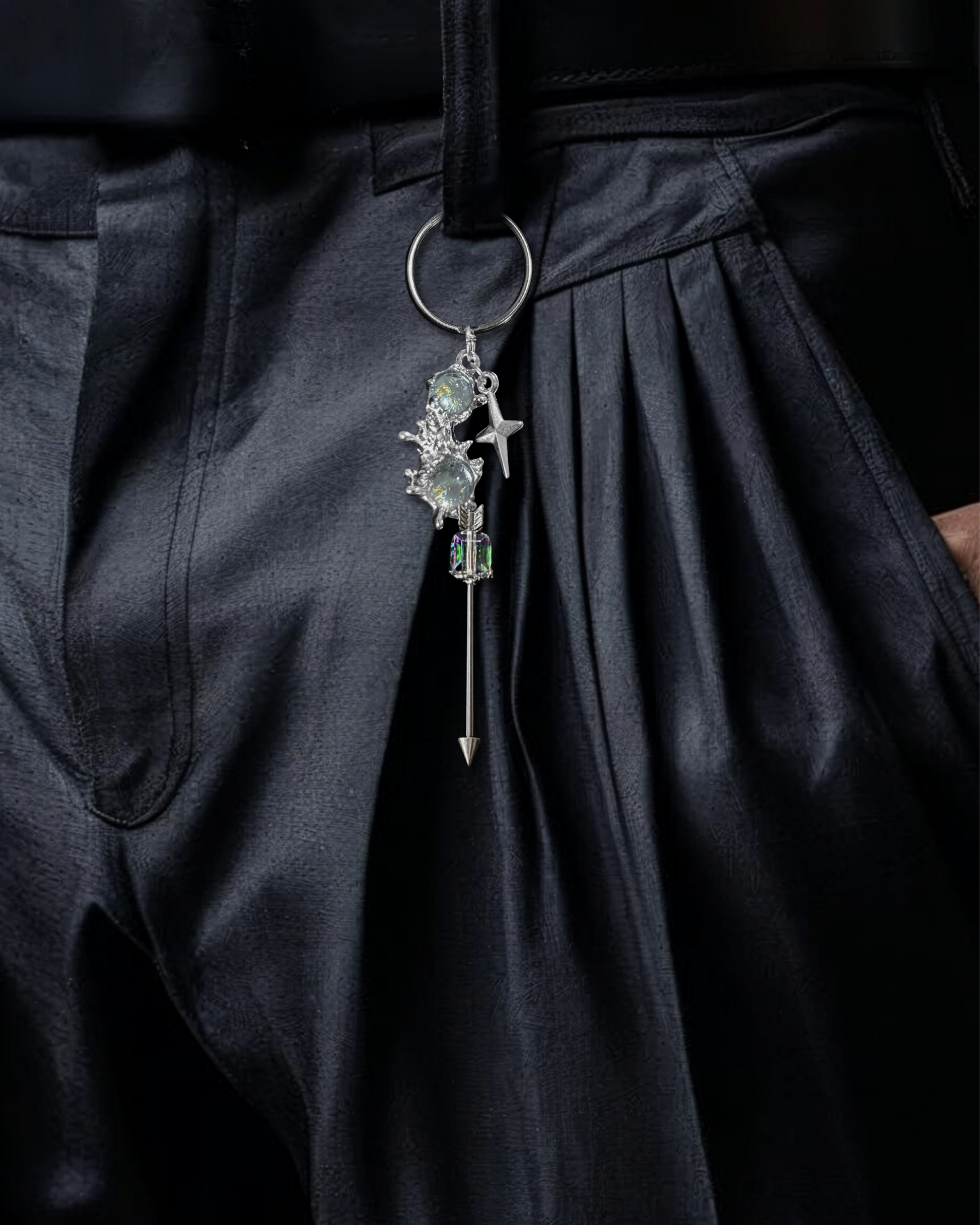 Iridescent belt chain adorned with crystal elements and arrow pendant details