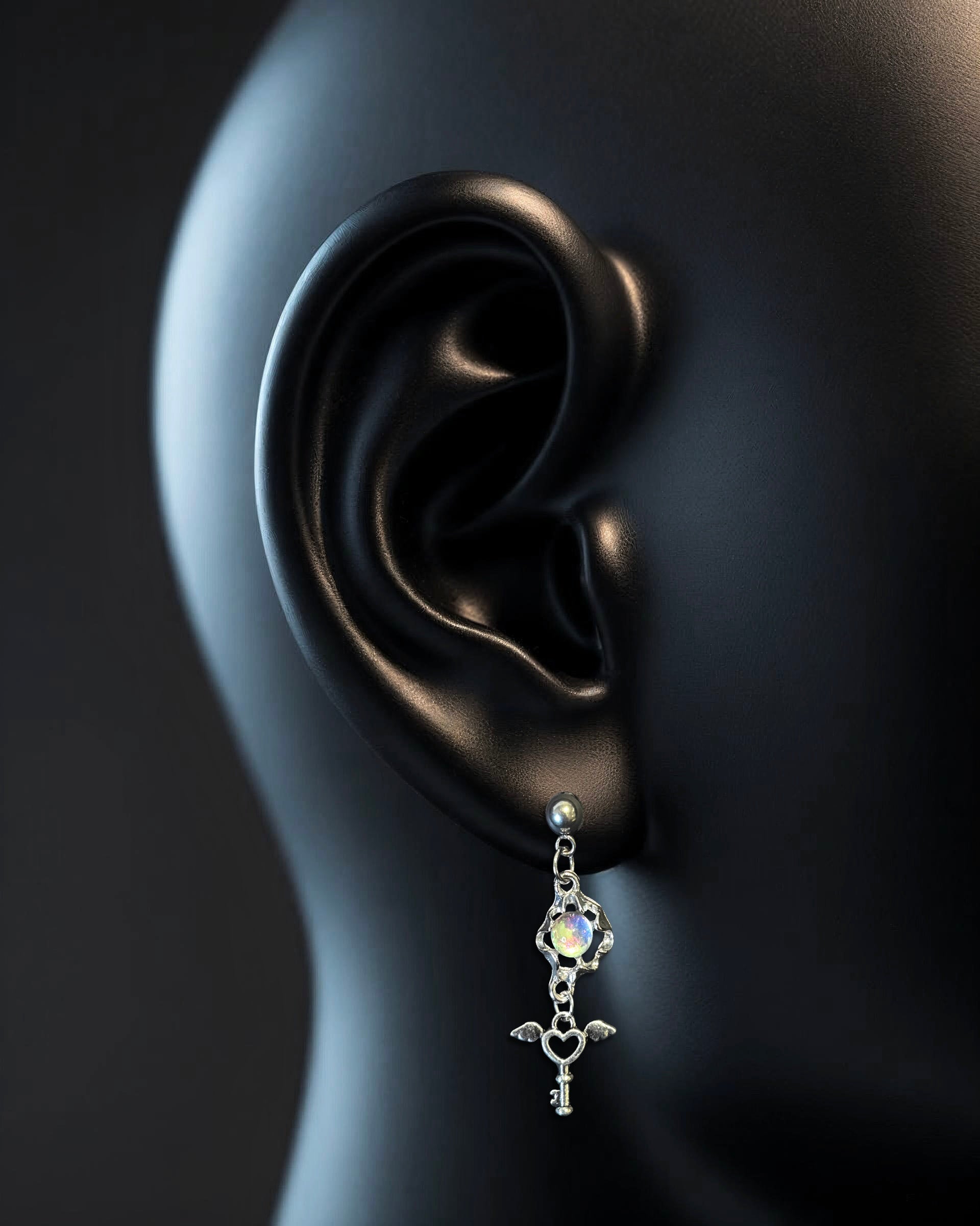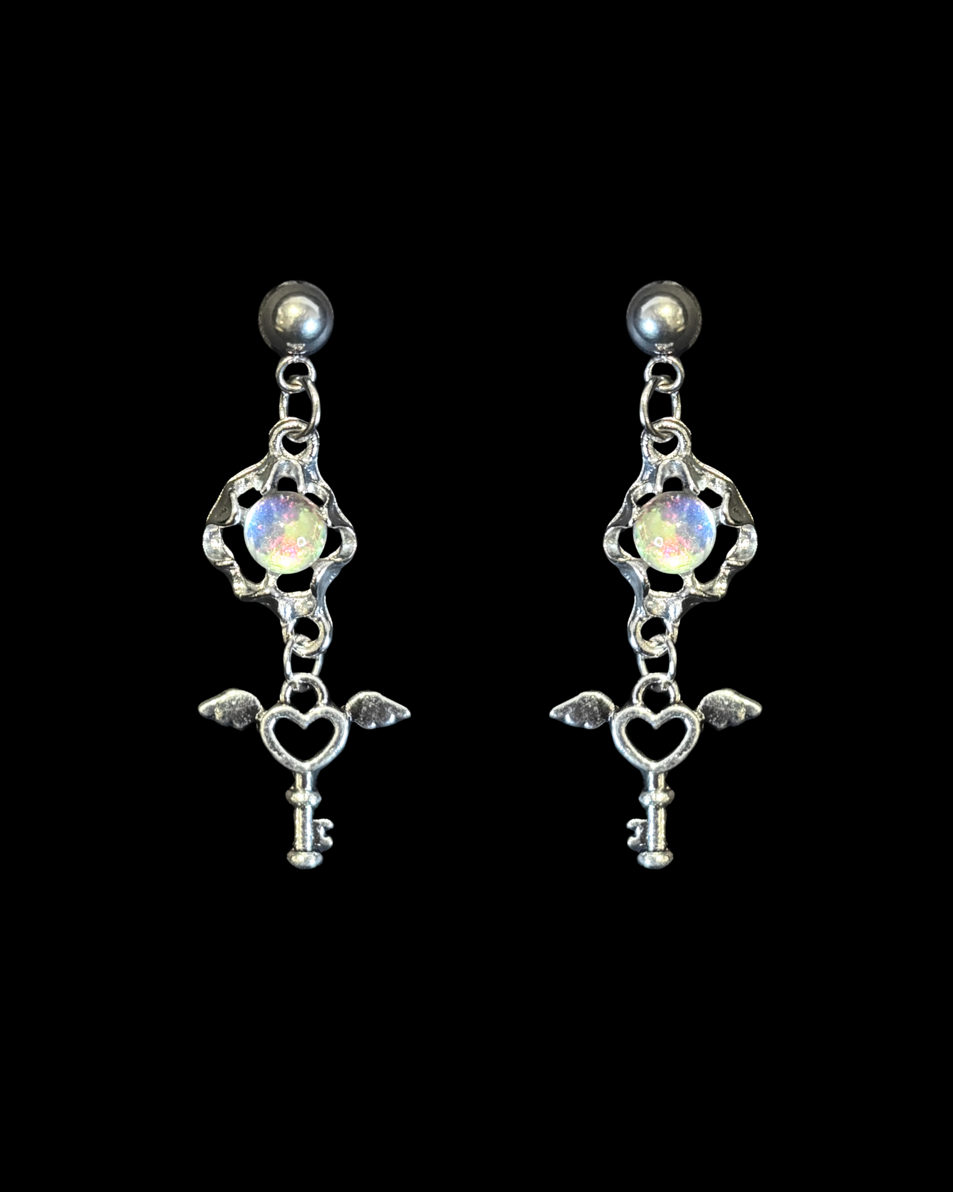 Ornate silver earrings with iridescent crystal settings flowing into winged heart keys
