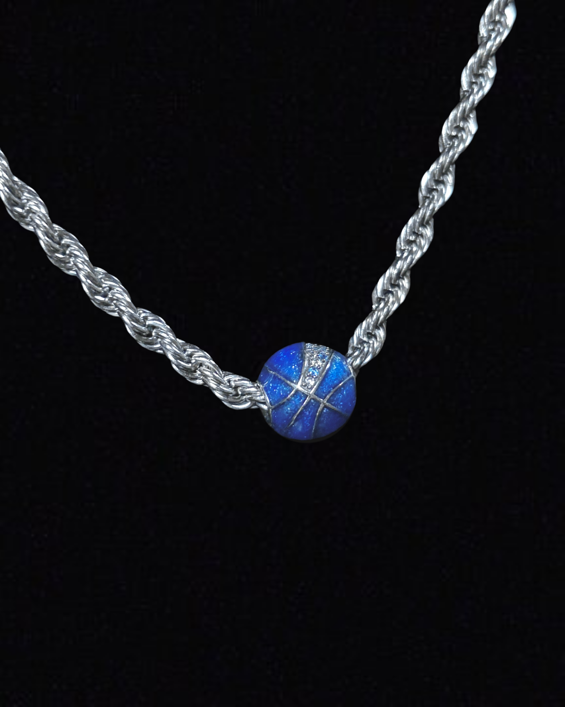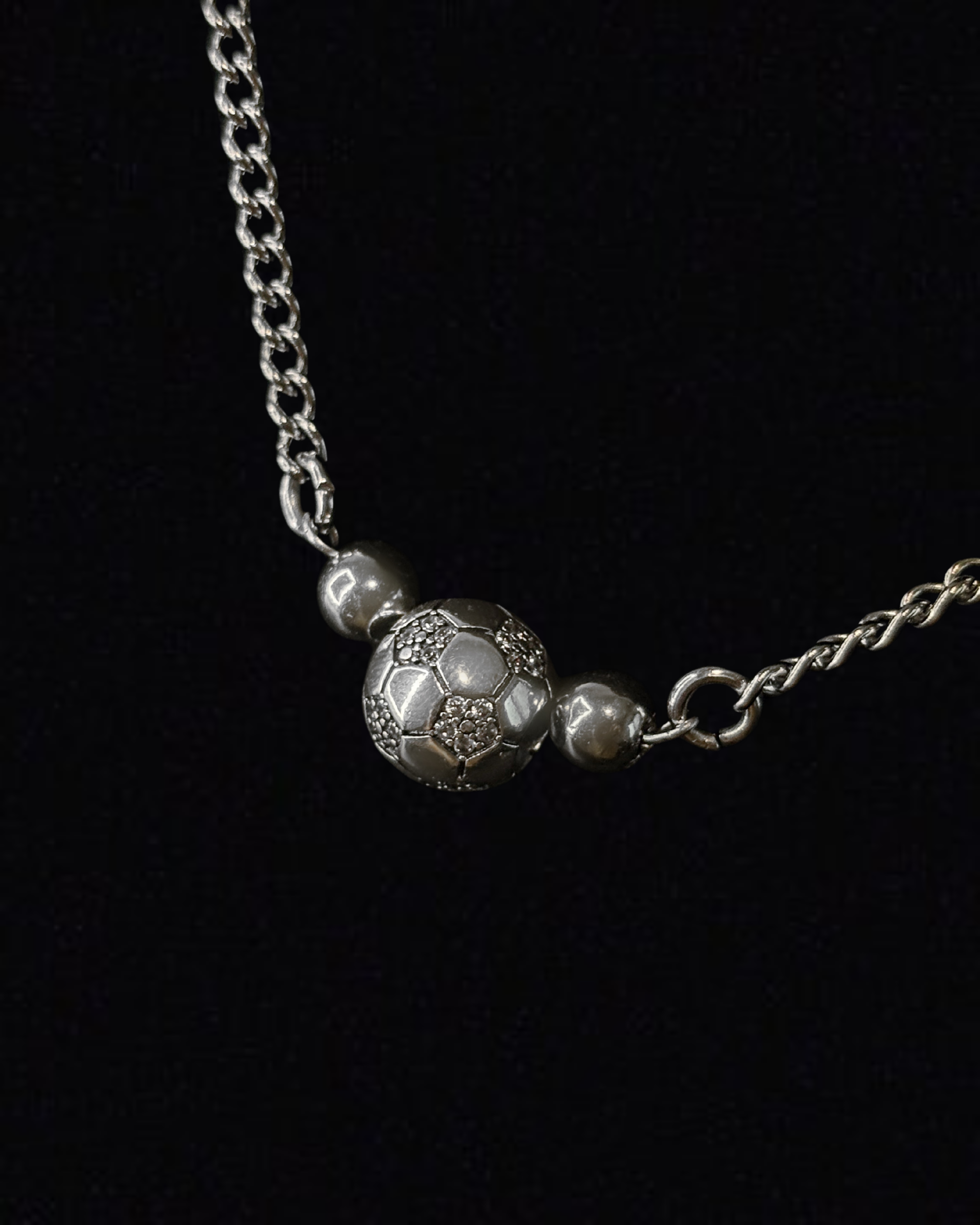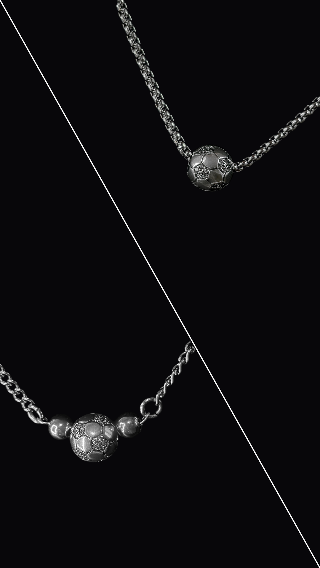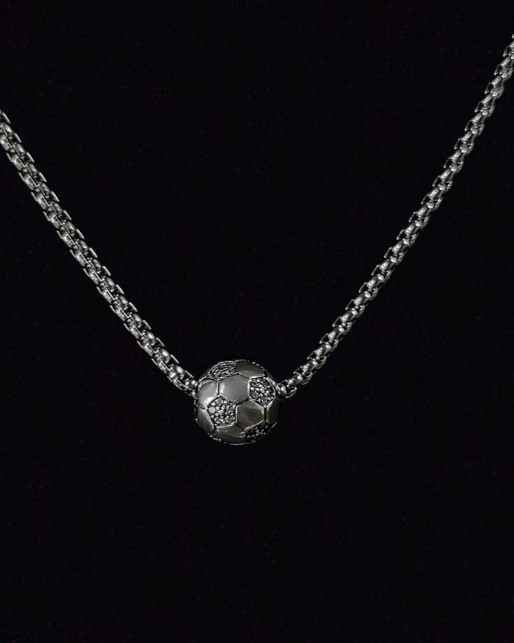 Fine chain with a sports ball focal point. Timeless grace in perfect symmetry.