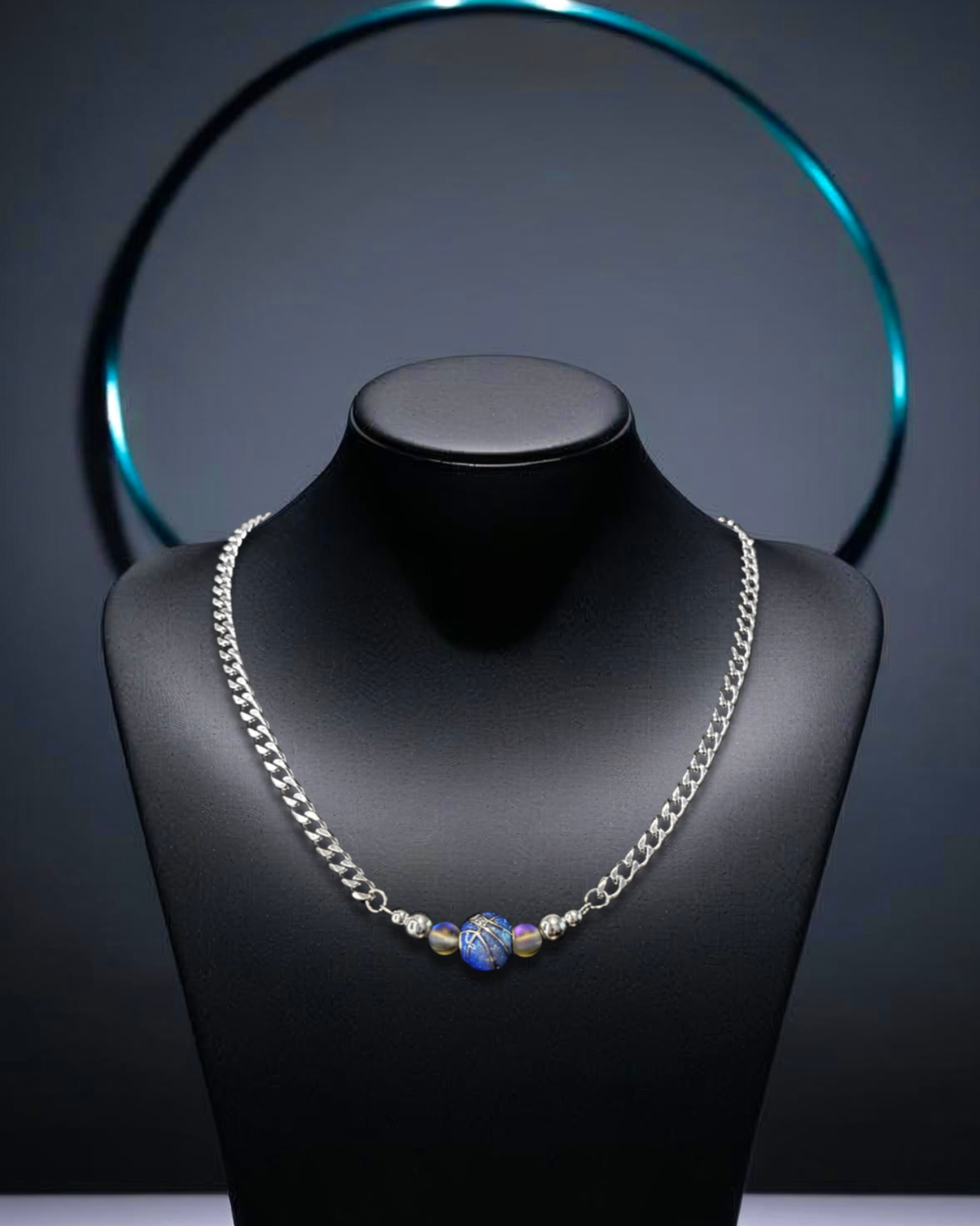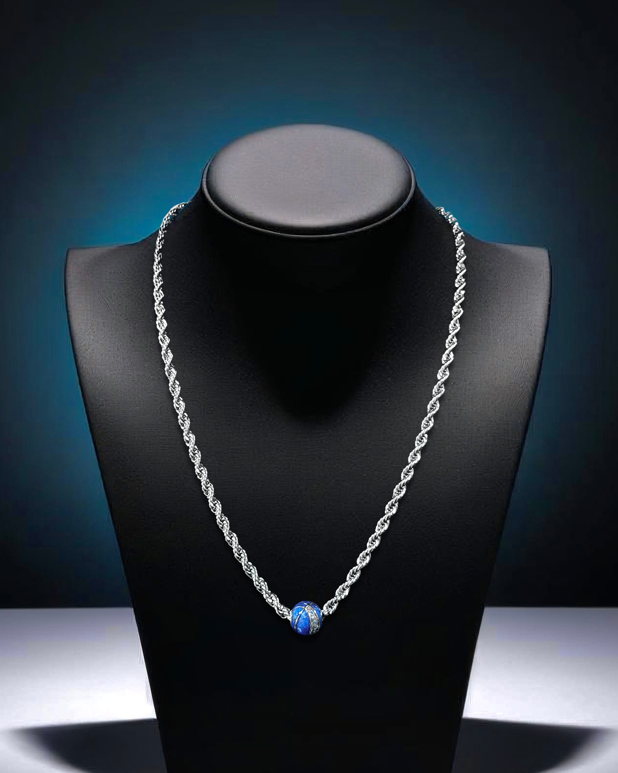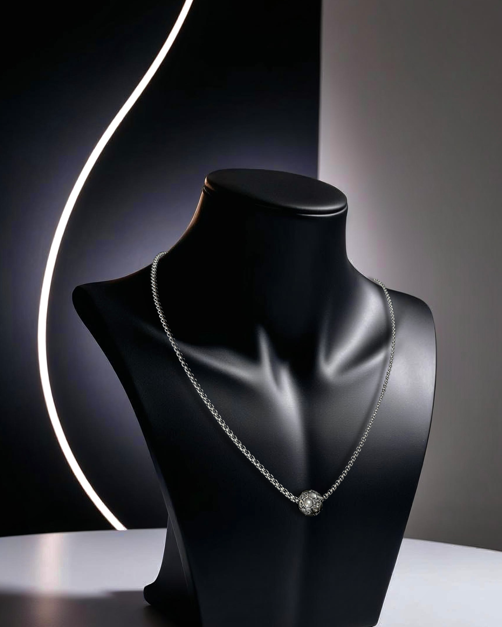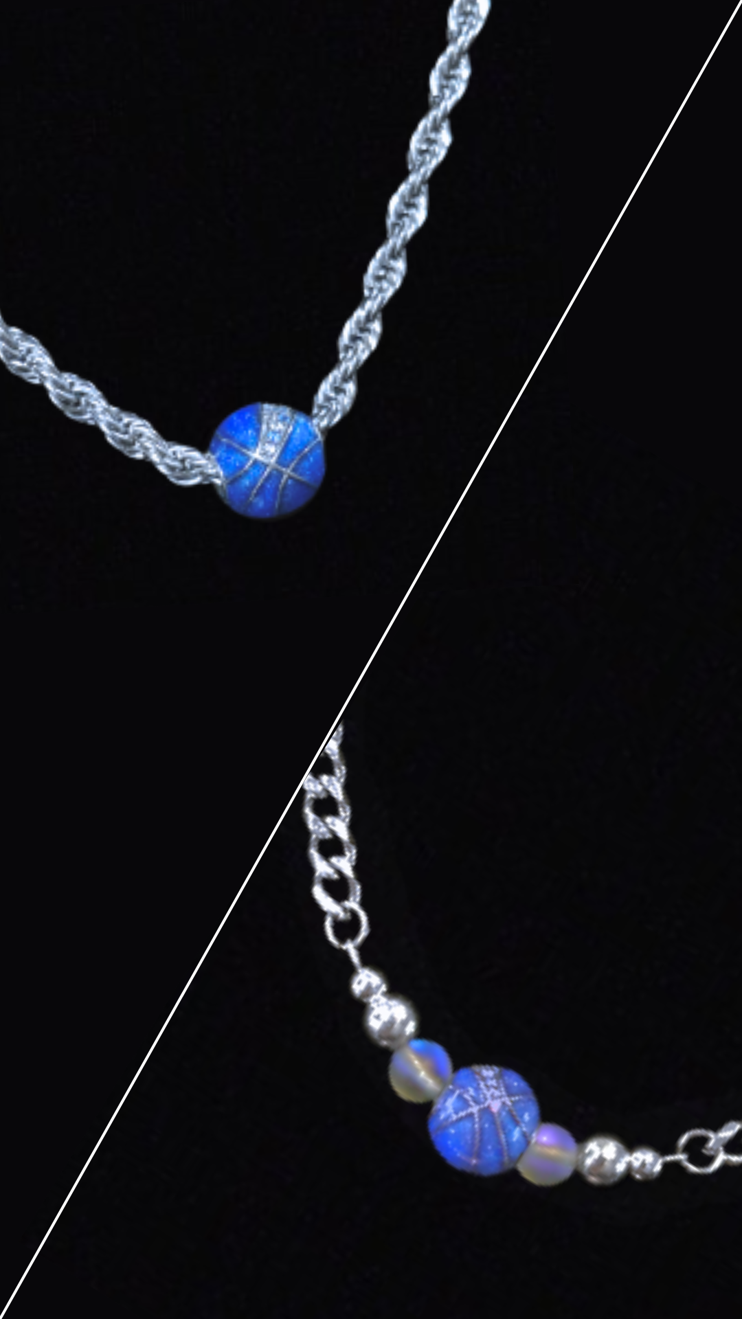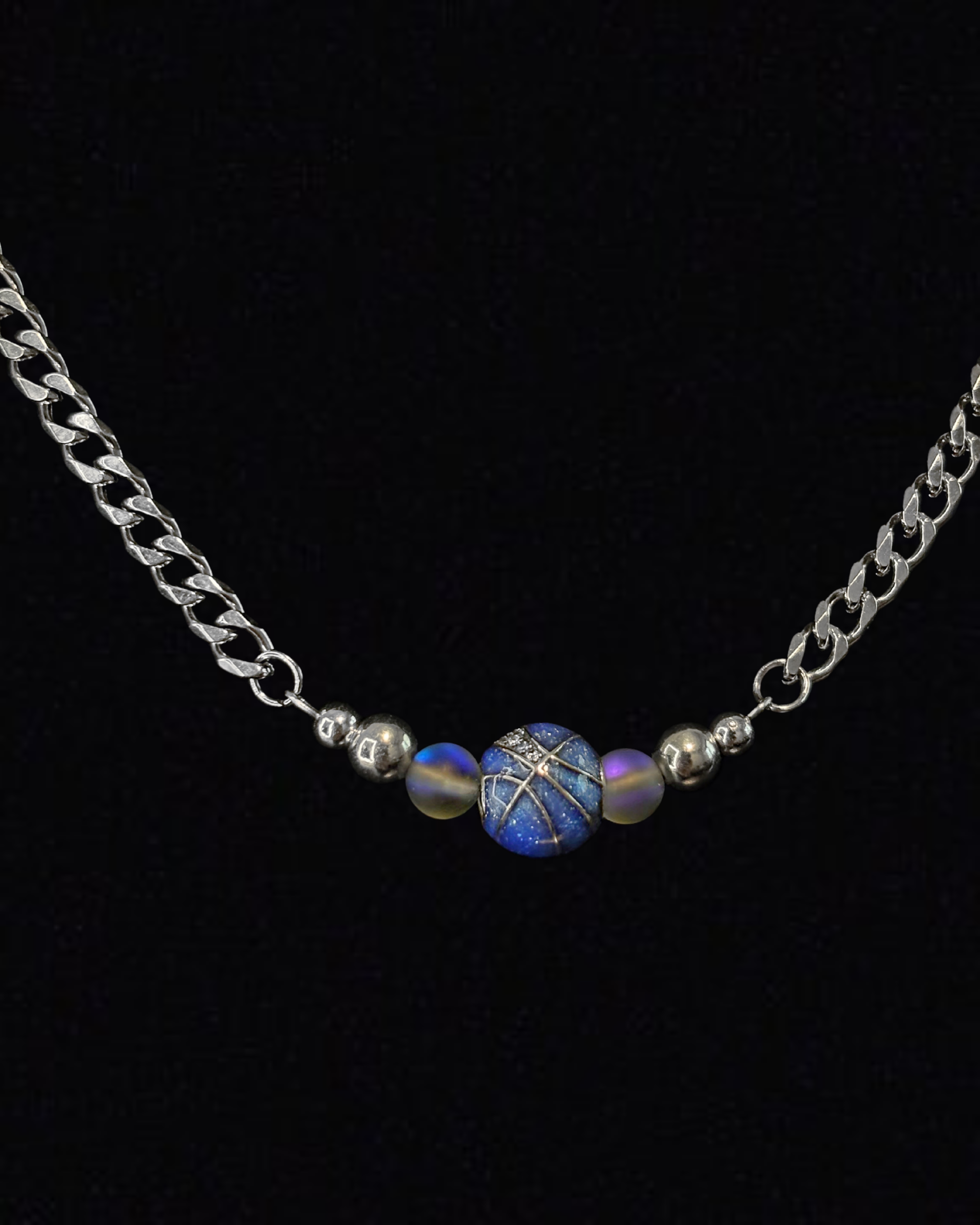Fine chain with a sports ball focal point. Timeless grace in perfect symmetry.