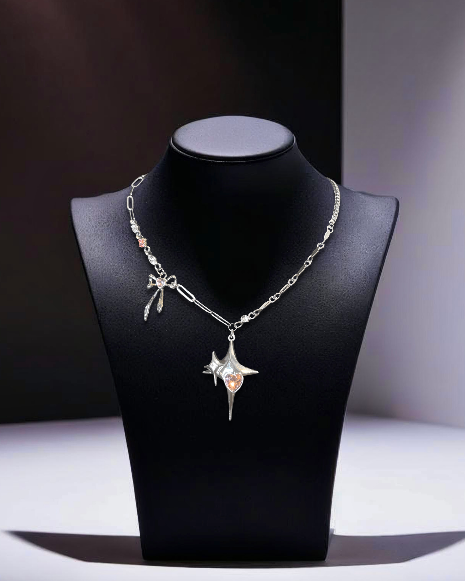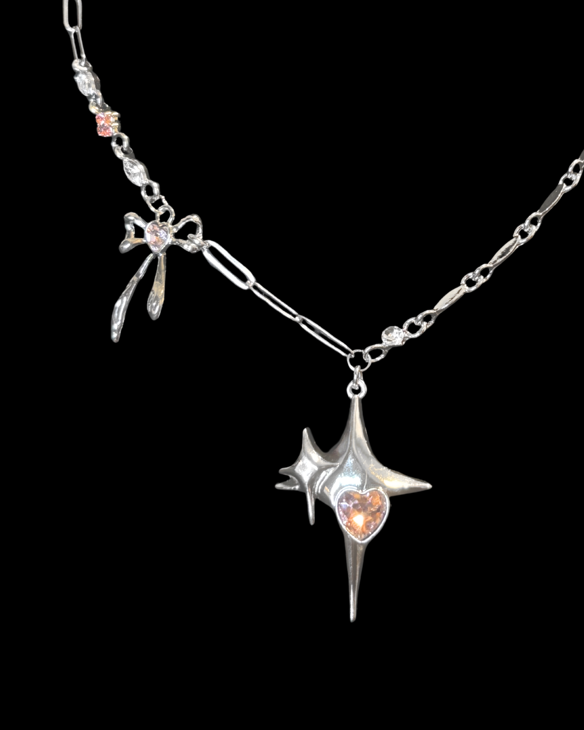 Dramatic star-shaped pendant with its radiating points and central amber stone on a mixed-element chain
