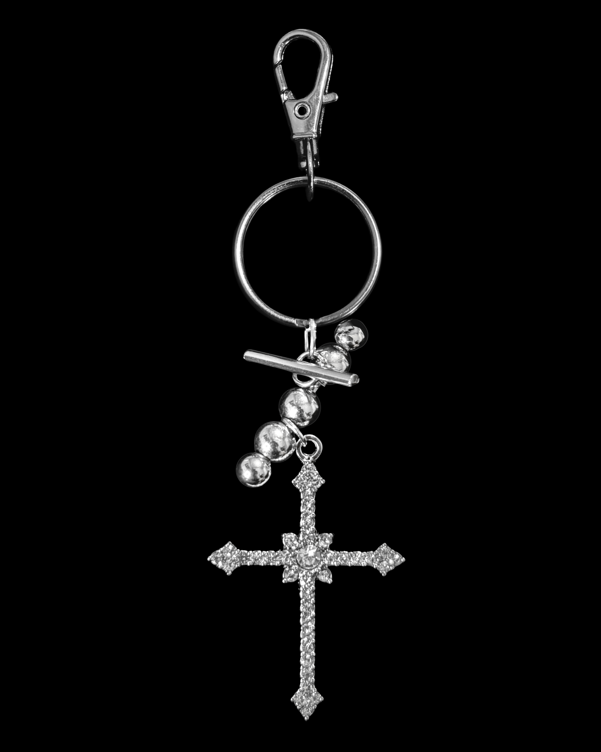 A unique belt charm with a statement crystal cross pendant suspended from linked details