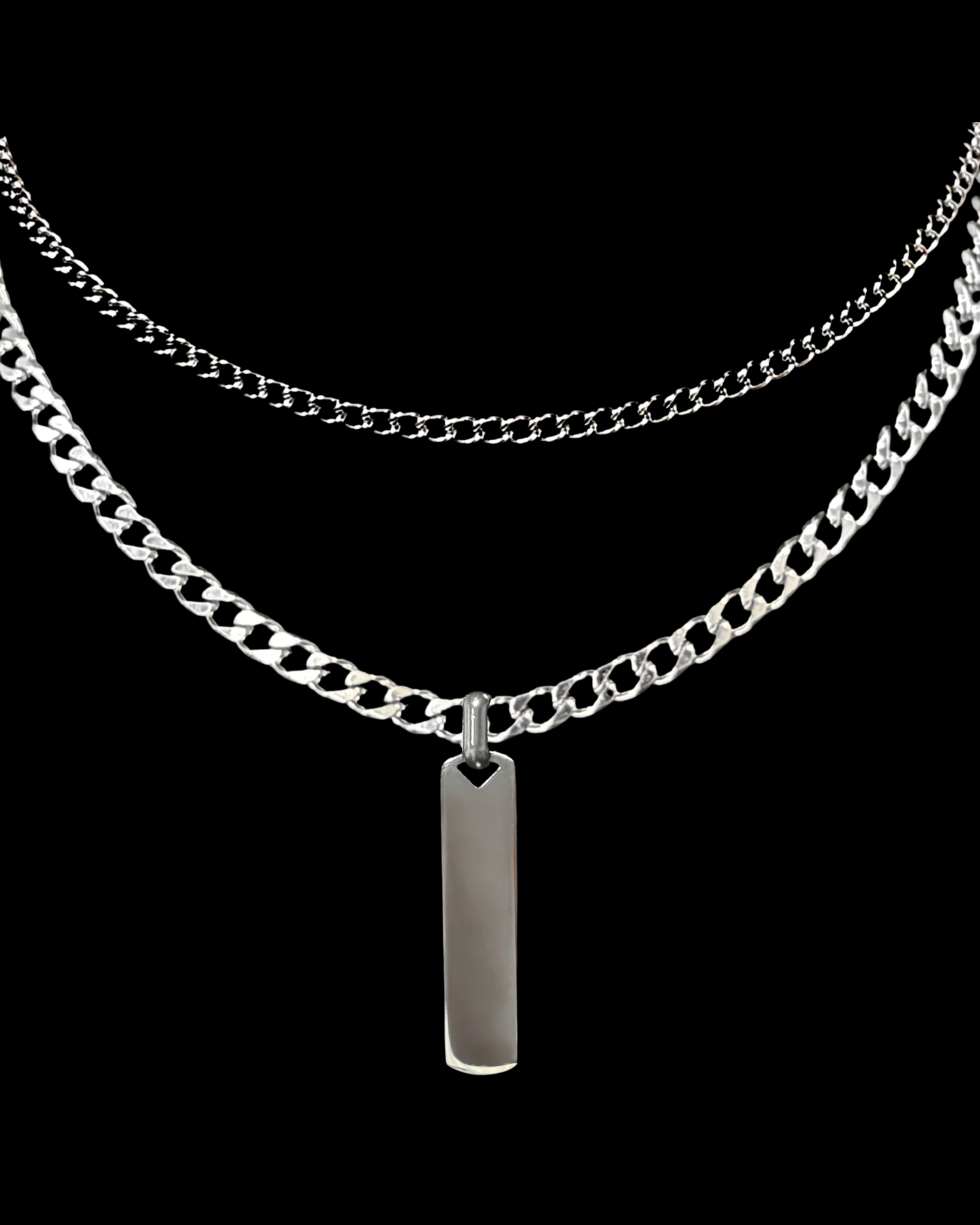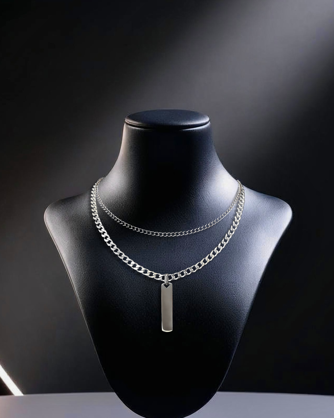 Clean dual-chain design with polished rectangular pendant. Epitomizes refined simplicity with geometric precision and mirror-finish surfaces.