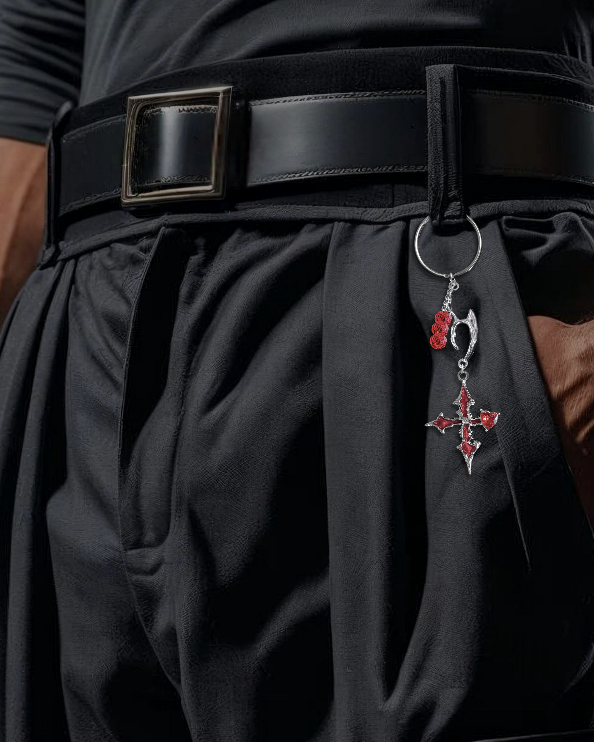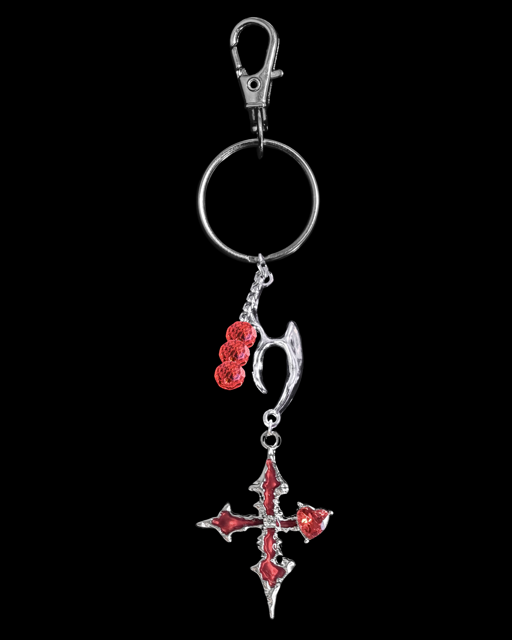 Gothic belt charm featuring red crystal beads and a gem cross pendant