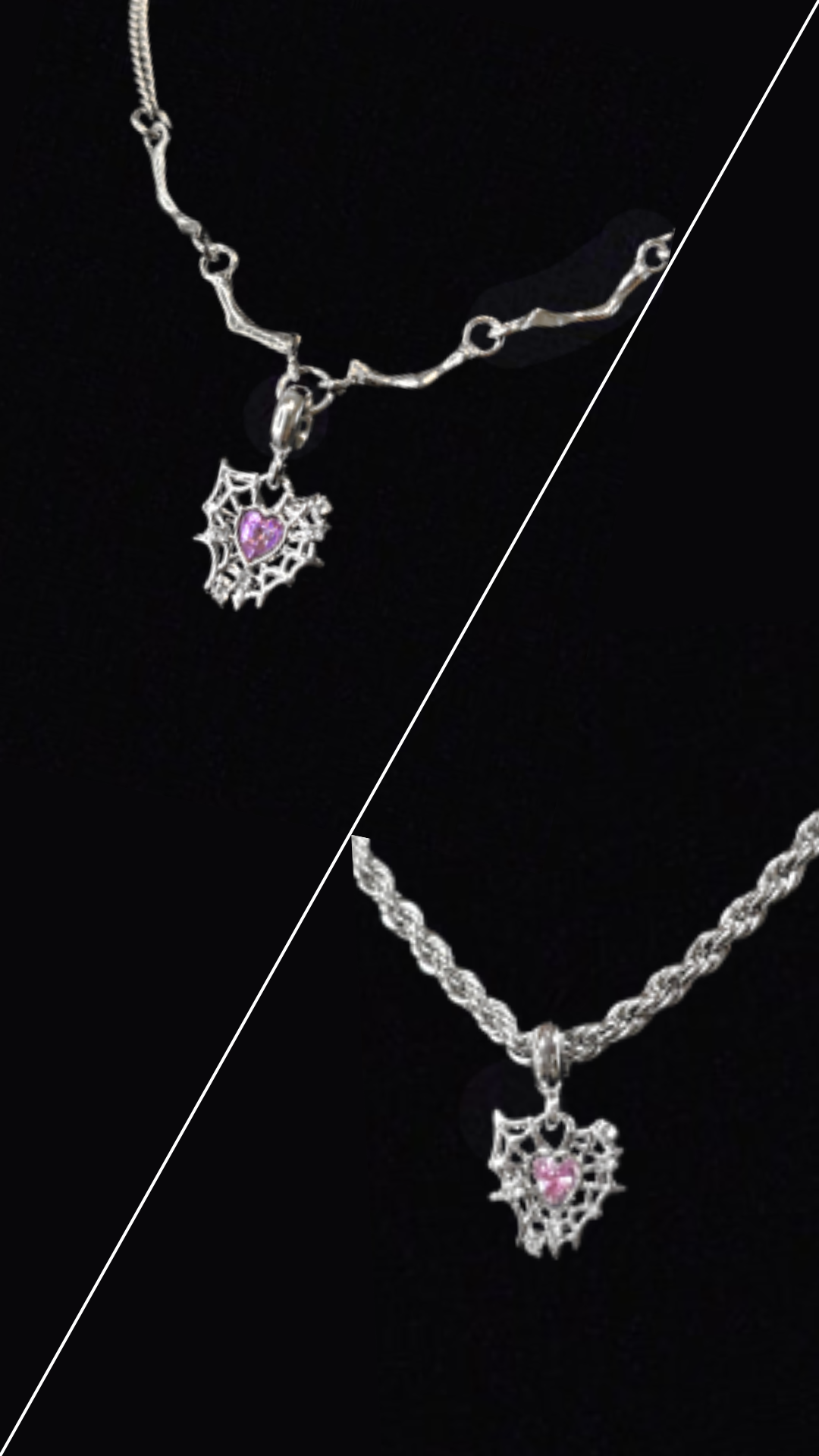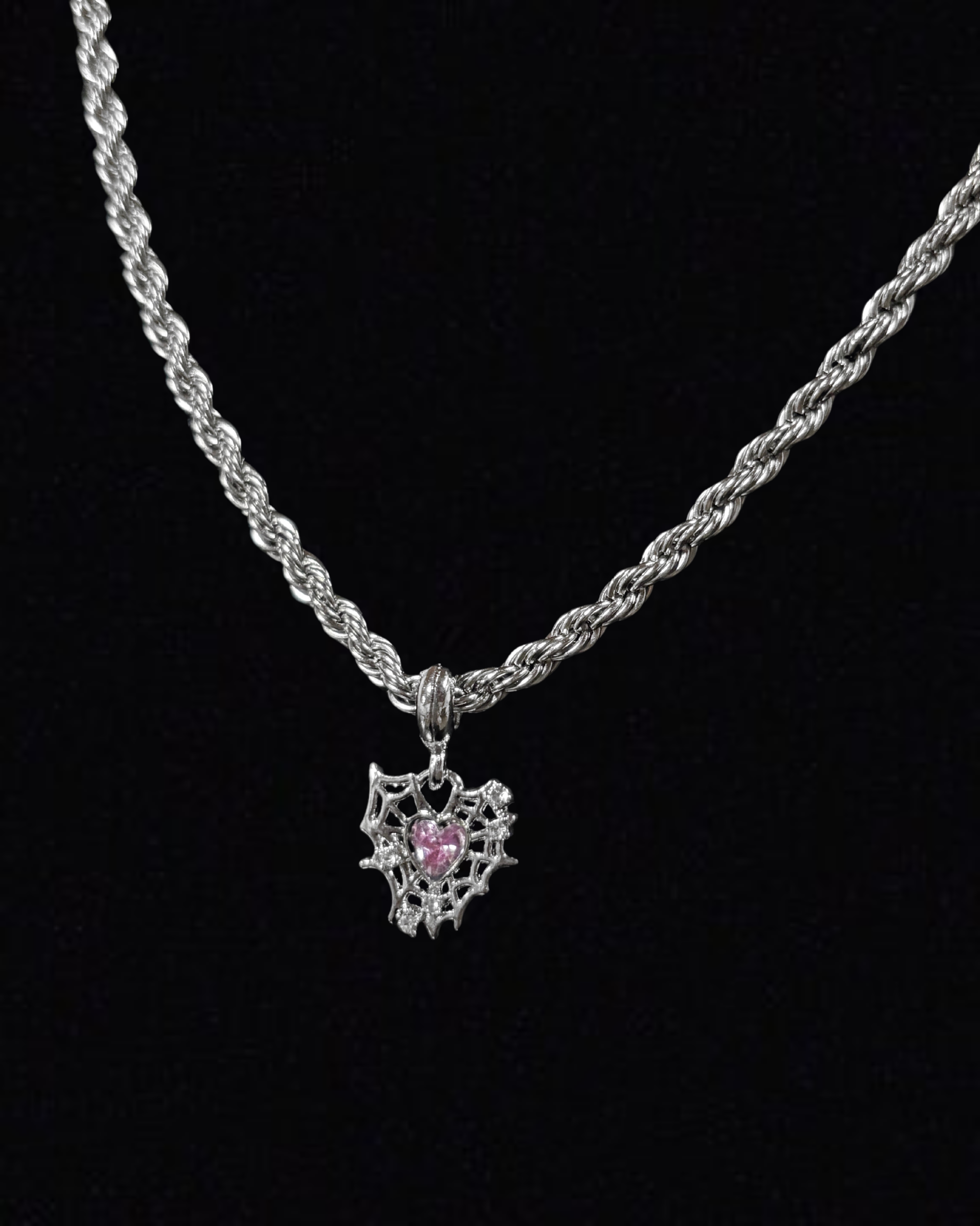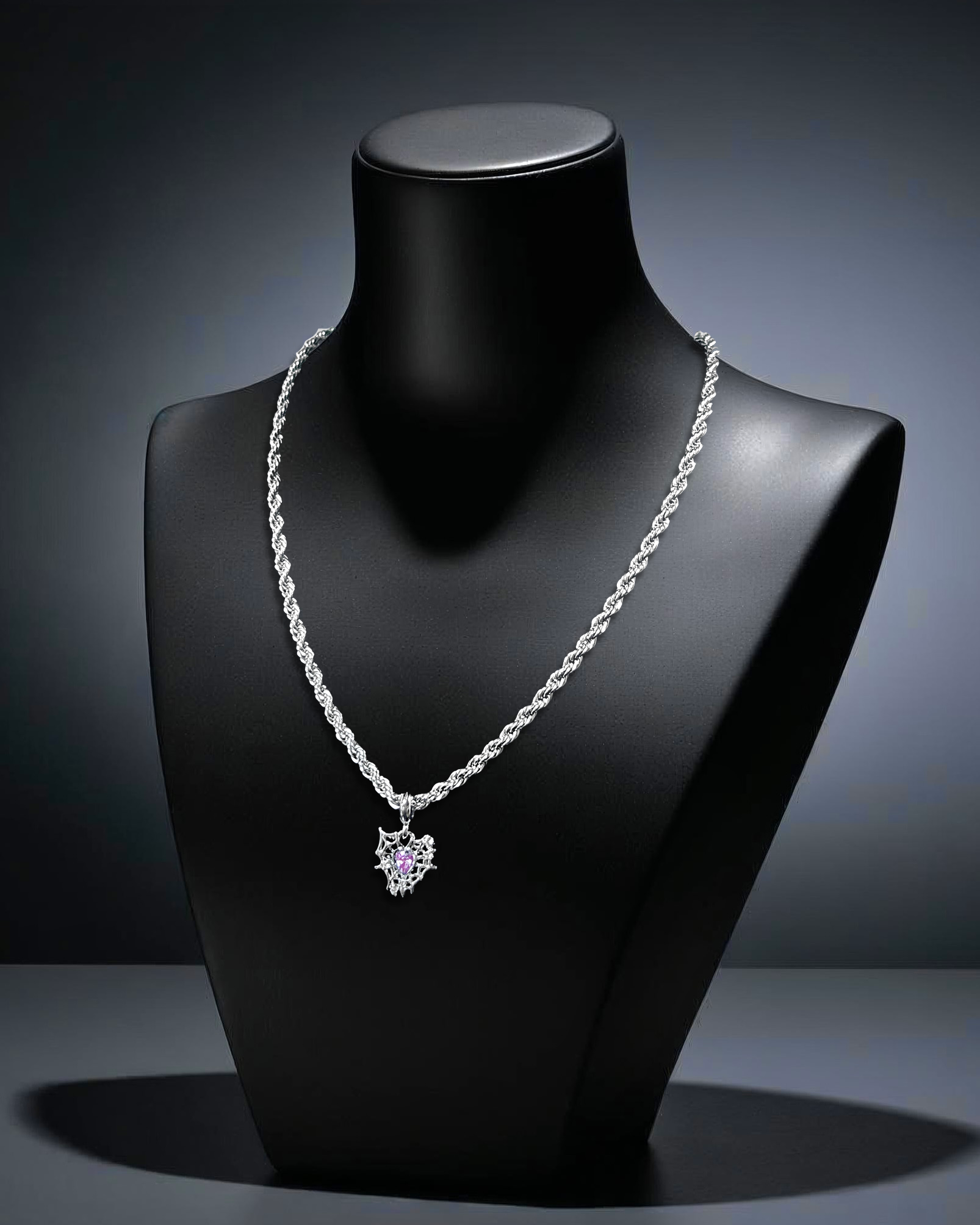 Stainless steel chain with sculptural amethyst webbed-heart pendant.