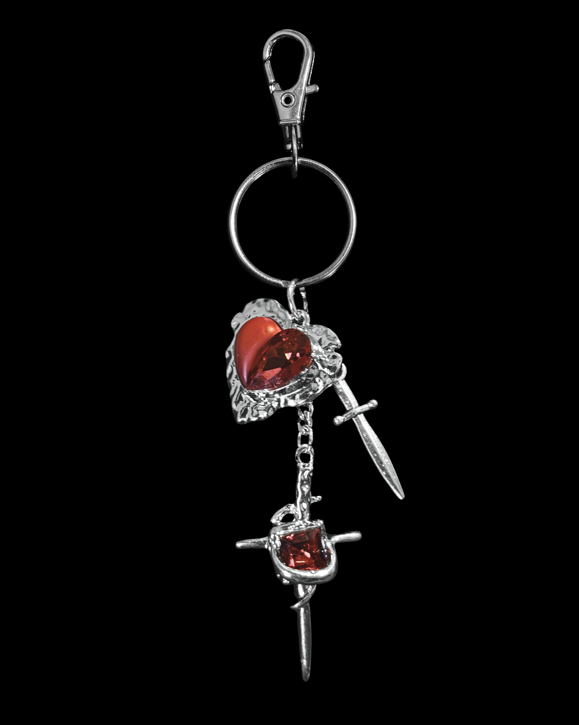 A fierce belt charm featuring a halved red heart connected to a dagger and gemstone cross
